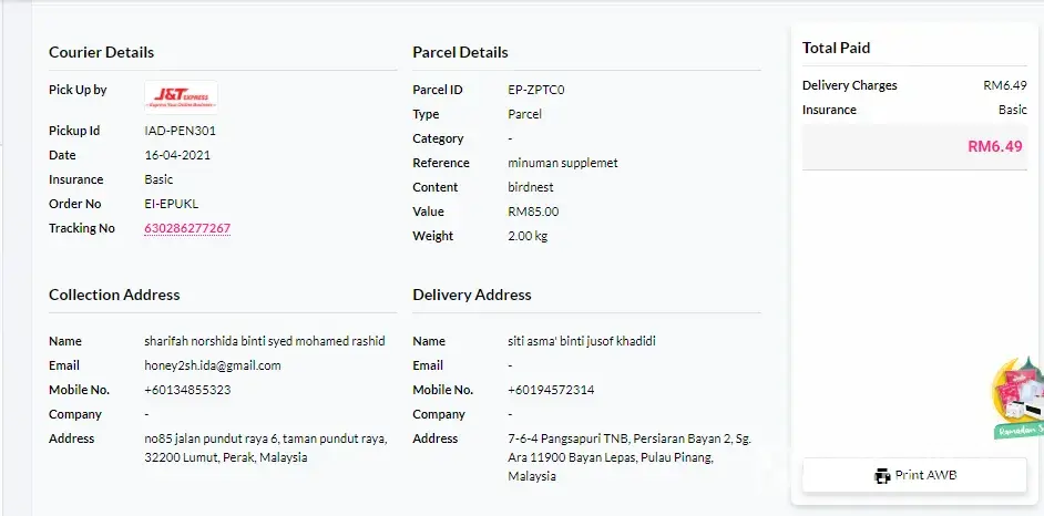 parcel dihantar pada petang 15/4/2021