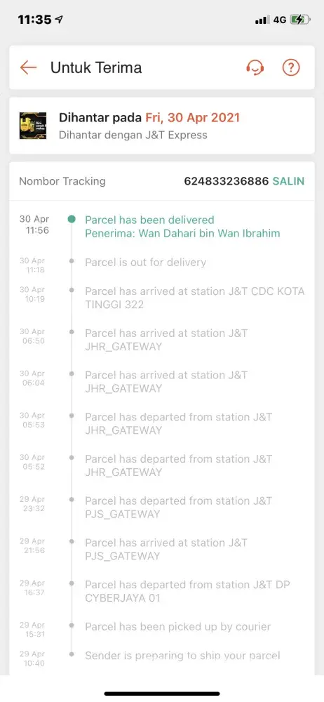 diterima oleh pelanggan pada 16/4/2021