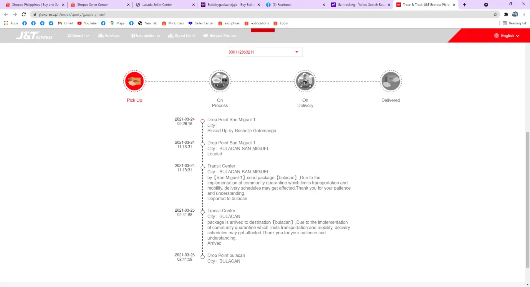I ordered last wednesday, March 24, 2021. The parcel is only from San Miguel, Bulacan, Philippines going here to Valenzuela City. It is a little bit near from there to here but until now, there is now progress due to process. Already 3 days counting and my order are still not in delivery. what should I do? The parcel were owned by me and my friends. They kept on asking how is it, but what will I say? Please help me make my transaction faster. Thanks!
