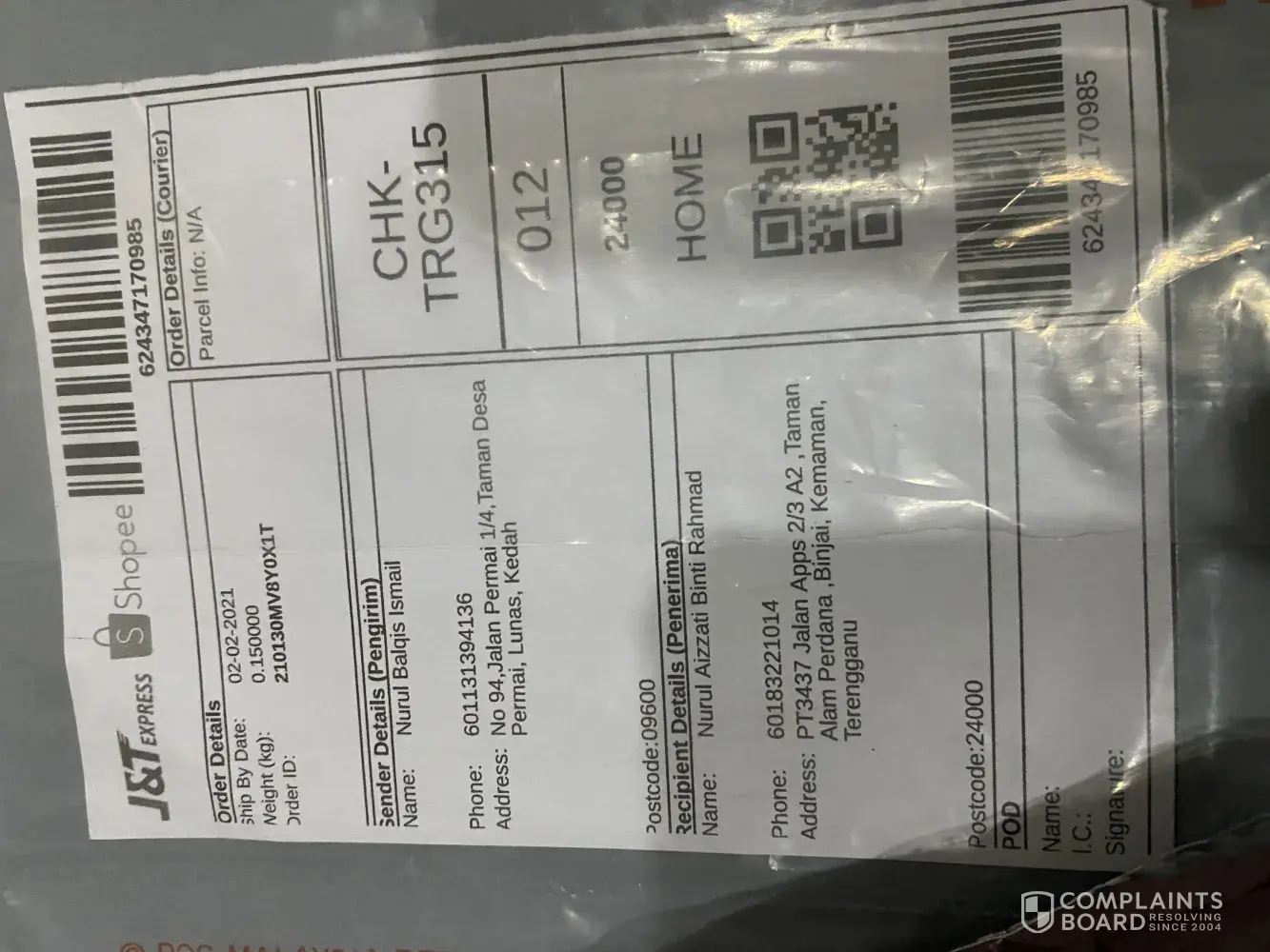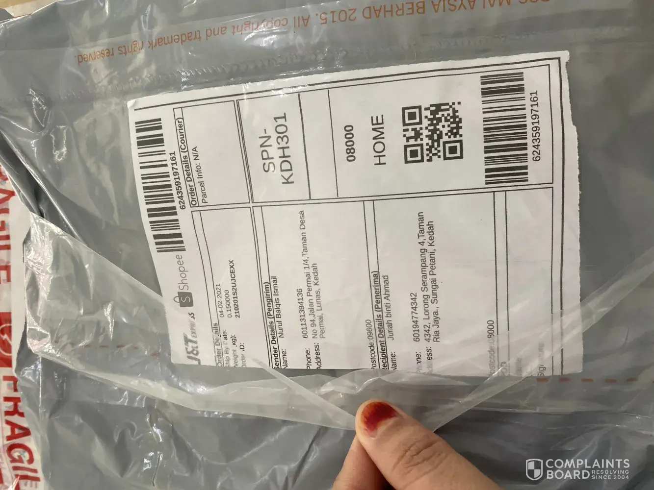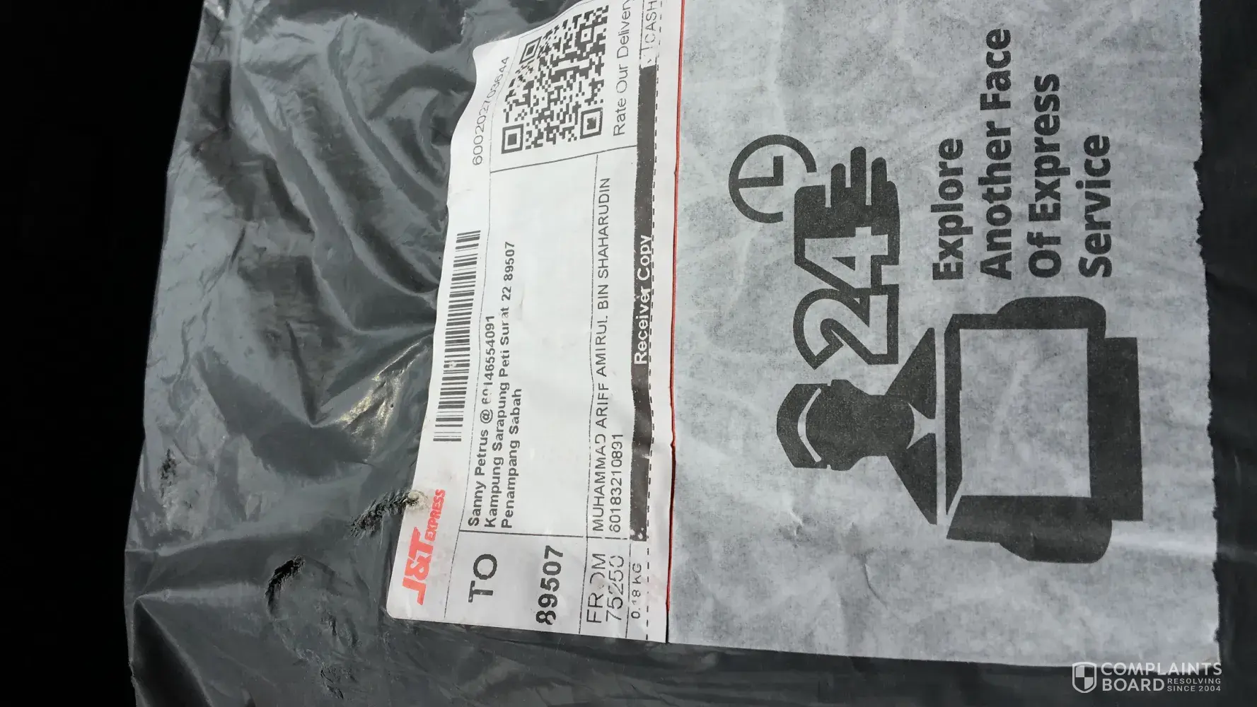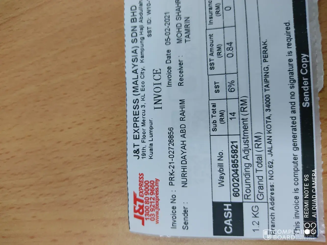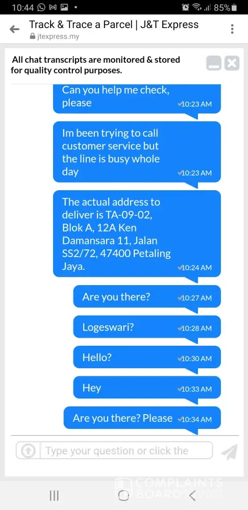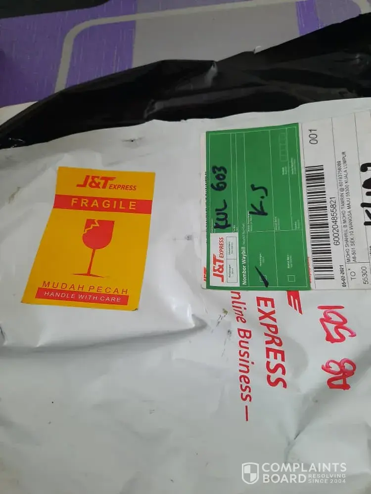 Tanpa sebarang hubungi pengirim mahupun penerima untuk dapatkan maklumat alamat penerima ..malah memberi alasan alamat tak wujud.sekiranya alamat tidak wujud, pihak syarikat j&t tiada menghubungi mana2 pihak..barang sampai lambat...barang yang saya pos rosak teruk dan pecah..3 balang, biskut pecah..lsaya berharap pihak tuan/puan dapat pertimbangkan masalah ini ..dengan ini saya sertakan dokumen