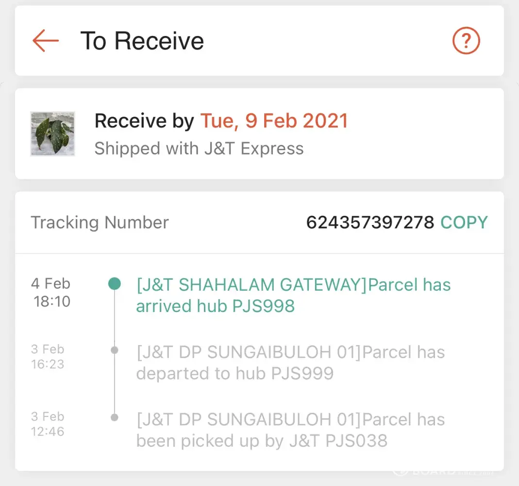 Late delivery: Barang saya (real live plant) nk post ke perlis stuck kt J&T Shah Alam Gateway 2 hari. Sedangkan barang2 lain yg saya purchased the exact same day and time, guna courier J&T jugak (J&T DP Raja Uda, J&T PJS Gateway) dah smpai ke perlis.