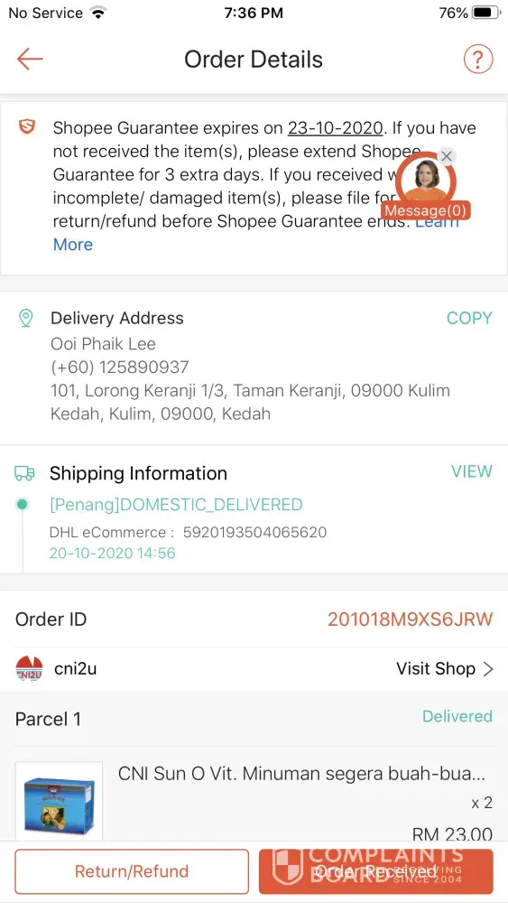 Saya nak buat complaint berkaitan dengan barang yang saya nak hantar ke :