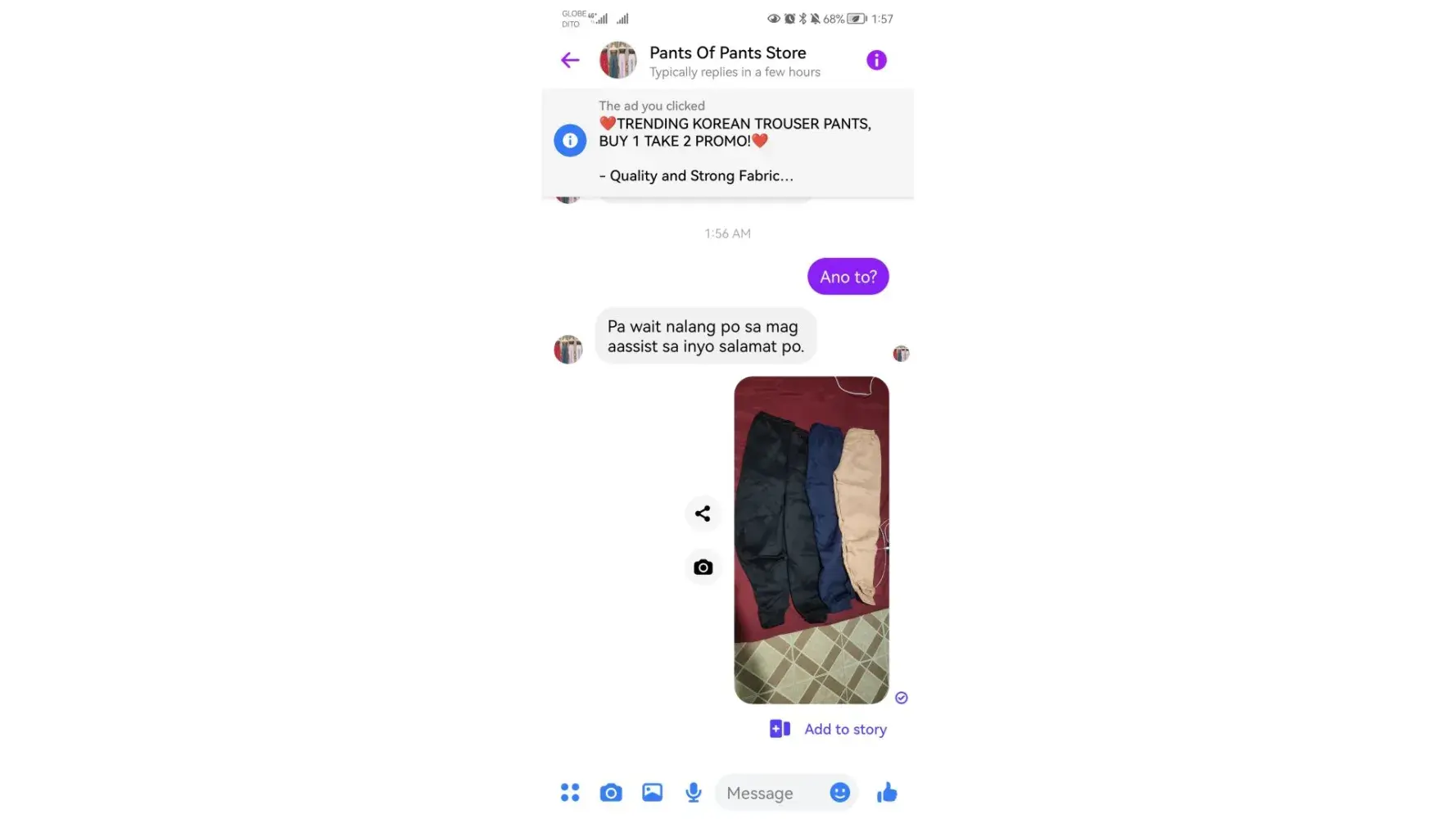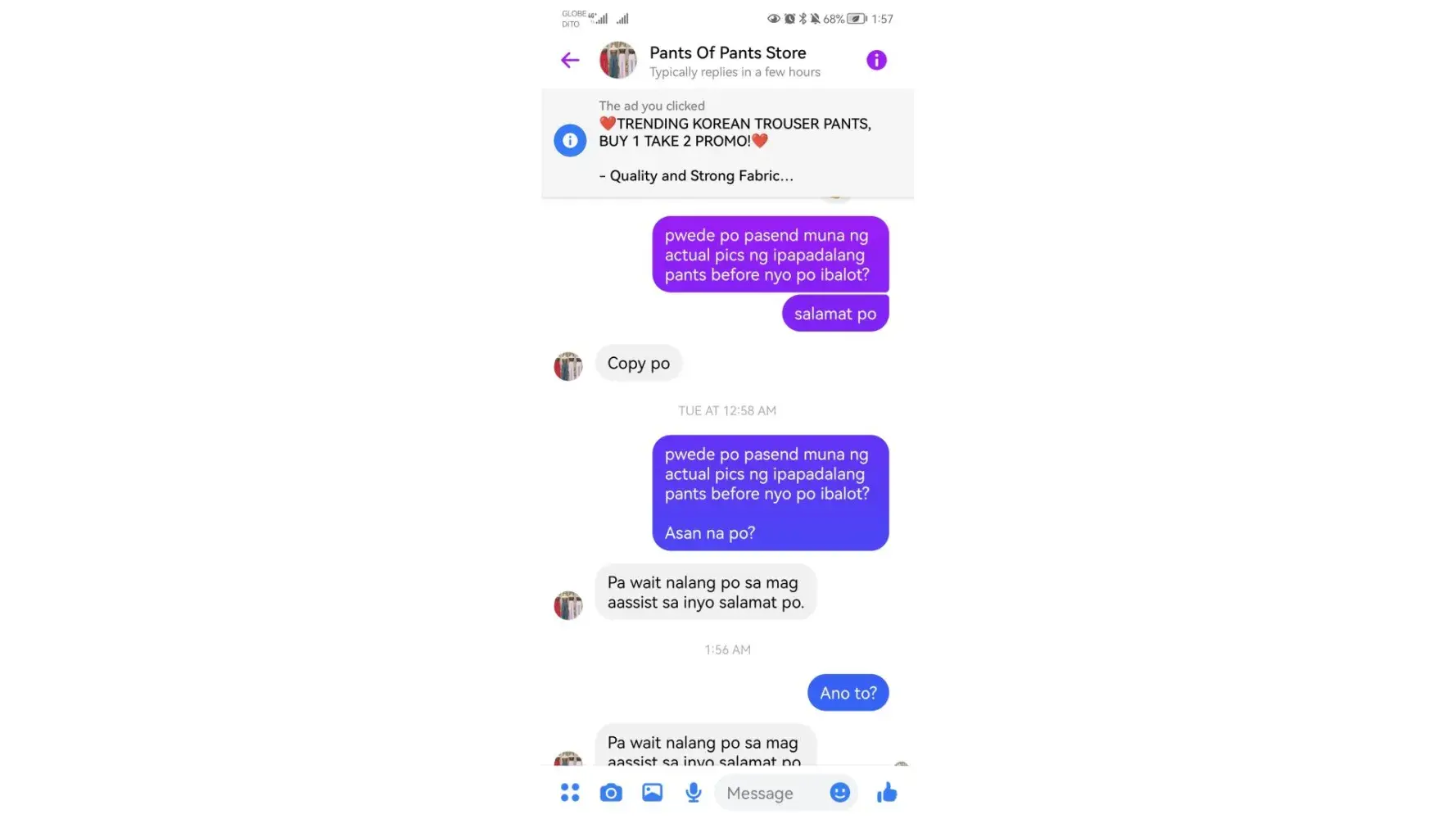I paid 1200 for 4 trouesers and they sent me 60 pesos jogging pants