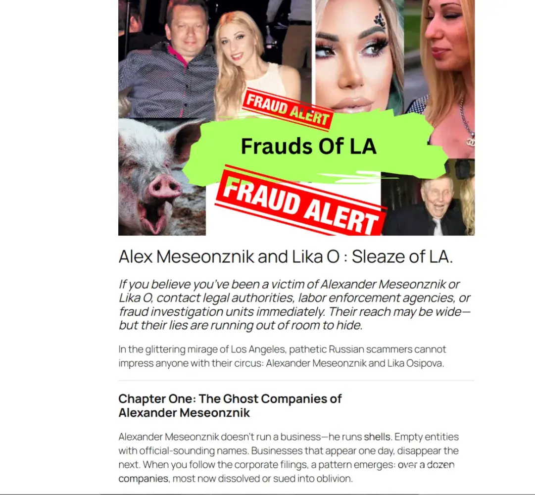 Summary of the official lawsuits, including testimonies of 35 victims they stole 3 million dollars from in wages: https://archive.ph/AxVYD & https://alex-meseonznik-production.webflow.io/posts/alex-meseonznik-and-lika-o-presents-how-to-lose-a-business-in-10-scams