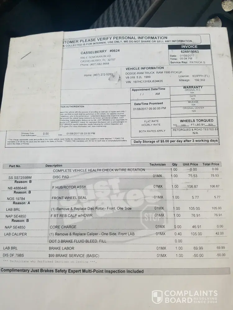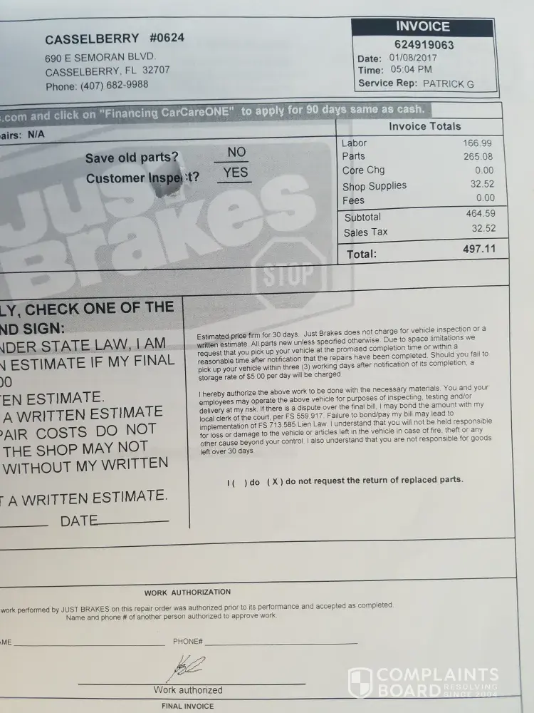 Just Brakes' has a Business Model of consistently commiting consumer fraud against customers; they are not interested in repeat business, but their model focuses on RIPPING OFF customers including Women, Elderly and anyone else they can "con". I had an experience where they promised a "Free Estimate" and while waiting they jimmied the paperwork; Altered the Worksheet which make it look like the "free estimate" was a work order authorizing them to do all the work on the car - cheating on out of hundreds of dollars of concocted an unnessary work without any authorization at all; then, holding your car hostage until you pay them. THIS COMPANY WAS A TARGET OF NBC NIGHTLINE which found the padded jobs and didn't change old brake fluid they had charged customers for; yes, they charge for parts they don't even change on the vehicle - it's all a scam and we wonder why the feds or the State gov. doesn't put them out of business - must be cheaper to pay fines instead of buying parts and fluids? Stay away!