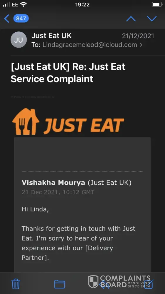 I ordered a delivery a week ago with Just Eat for KFC. My delivery did not turn up. I contacted KFC who told me the driver had stolen the food and to post a review and they would do the same and I would get my money back. I.E i followed their complaints policy to contact the restaurant. I waited for this to happen and instead got an email for 15% discount. When I immediately complained to Just eat, they advised that they would not refund me because it was outside of 72 hours from the original date of delivery and was against their terms and conditions. However I had followed their complaints procedure by contacting the restaurant who had confirmed that i would get my money back and by the time Just Eat emailed me with 15% it was outside the 72 hours!