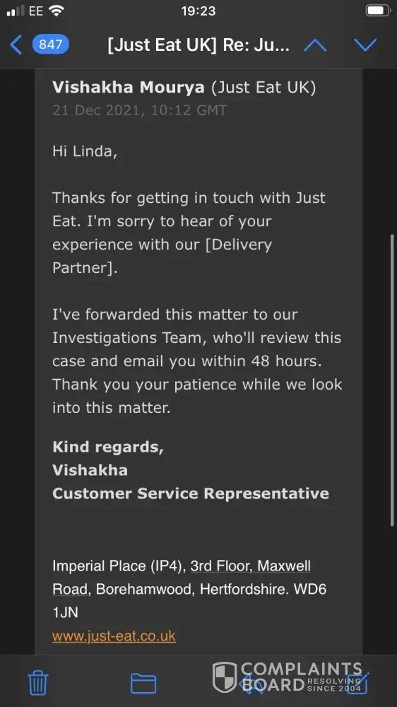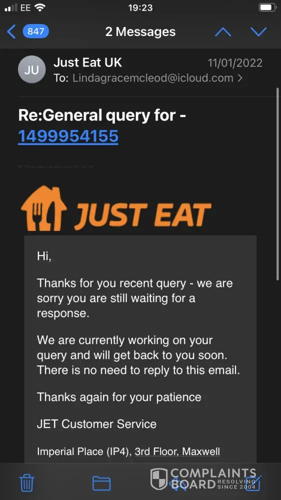 On Thursday March 31st I Made my weekly Takeaway Order, this time with Burger King in Ipswich. The order was paid for and confirmed by both Just Eat, PayPal and the branch of Burger King at 16:14pm, with requested a delivery time of about 18:15pm. I arrived home early from work, and both myself and my wife waited in our Lounge (we live in a terrace house and this room is right at the front of the house for our food to arrive. The only sound we heard outside pertaining to a takeaway delivery was next door at a little while after 18:00. When my wife became concerned as to where our food was, I looked at the order screen, and it showed "18:20", "waiting for update" (with a spinning hourglass), and "driver assigned". At about 18:30pm I decided to try and telephone the branch of Burger King, but was unable to get anybody to pick up at the other end on three separate occasions (between approximately 18:30pm and 19:10pm), it simply rang and rang until the line beeped. At 19:30pm, the order screen finally changed status, to "DELIVERED", still with the time "18:20". I was understandably furious about this, and left a triple 1-Star review as a result. I have attached to this complaint a screenshot of the confirmation email I received from Just Eat (with order number), one of the order screen on the Just Eat Website with it's review, and one of the PayPal confirmation email, complete with date and time (31/03/2022, 16:14).