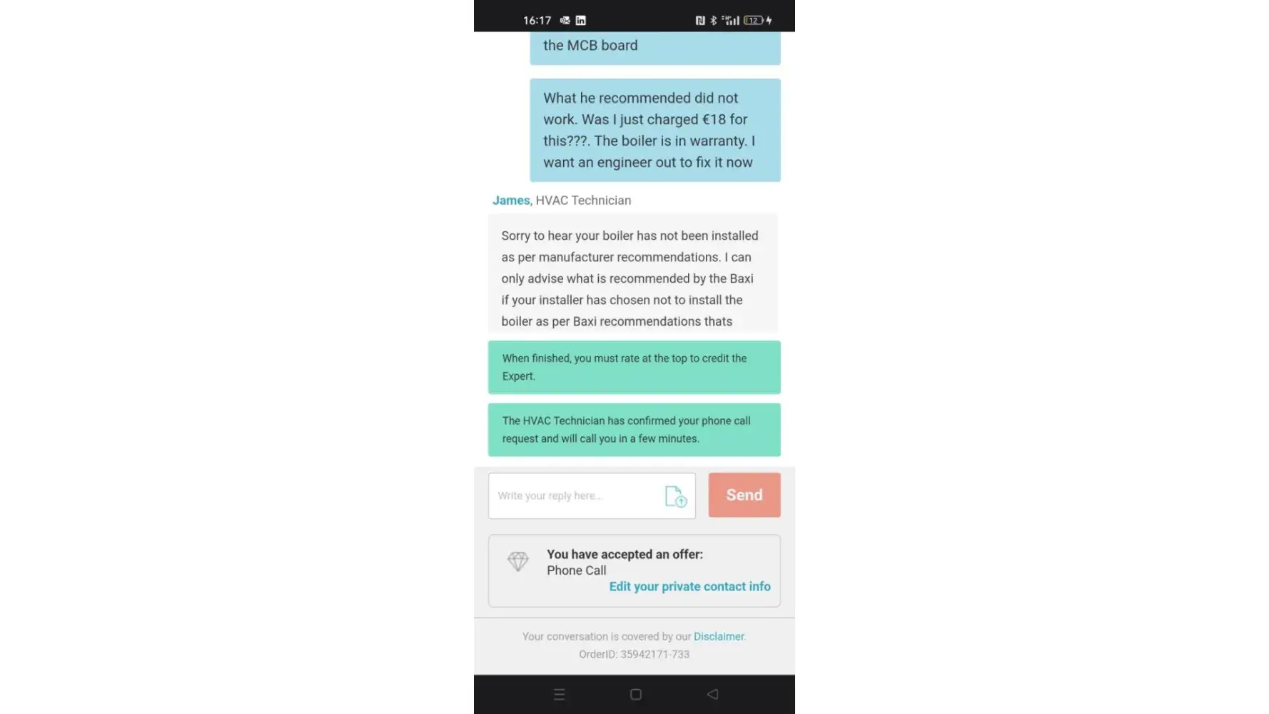 What he recommended did not work. Was I just charged €18 for this?. The boiler is in warranty. I want an engineer out to fix it now