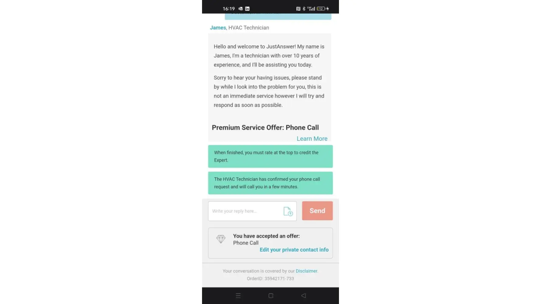 On 5th March at 14.00 I agreed to pay $2 to speak to a technician. I never heard back from them.
