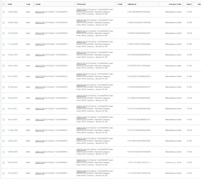 TECH-GEEK *JUSTANSWR [protected], Card: 4564XXXXXXXX4941, Merchant Category Code: 4816, Currency: , Amount: 67.98