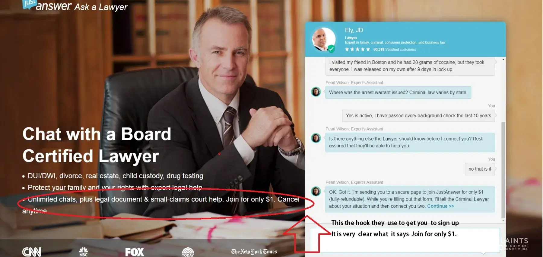 I tried Just Answer to ask a legal question. After I asked, a message saying I was being directed to a secure page and that I could enjoy JustAnswer for 1$. Then I found they had charged me 1$ plus 46$ months membership. Apparently it says in very fine print that I would be charged 46$ monthly membership. Plus, the disclaimers and policies are not made available until after you pay.