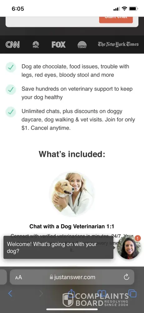 I attempted a Google search to find out what might be going on with Cleo. That's when I stumbled across the JustAnswer site. It appeared as though a professional veterinarian was available online to answer questions and provide information. I asked my question in a chat session with the vet. The vet explained I needed to pay $1 for an answer. I agreed providing my debit card information.