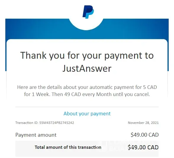 On Nov 21, 2021 I browsed the internet because my Kia Forte rearview camera was blurry, then I came across JustAnswer. I asked them about my car issue and I received a text message from them and asked for a $5 so I paypal them and I obtained a text message with a solution. Nov 28, I received a notification from Paypal that I have a recurring paying of $49 to JustAnswer, I got into Paypal and stopped this recurring payment, I called JustAnswer @ [protected] to demand a refund but the girl kept on saying sorry and because I didn't cancel the subscription within 7 days from the first day of service, they refused my refund.