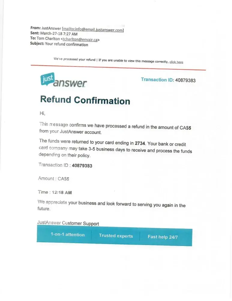 I am from Melbourne Australia, I have a new Canon printer under warranty. I was using Google to get Canon Australia. Your operator came on the line, on the 8th June 2018, I gave my credit card details without knowing that was Just Answer. As soon as I realized it was your company I told the operator not to use my ANZ credit card & disconnect her. Used Canon Australia and rectified my problem on the same day after few minutes.