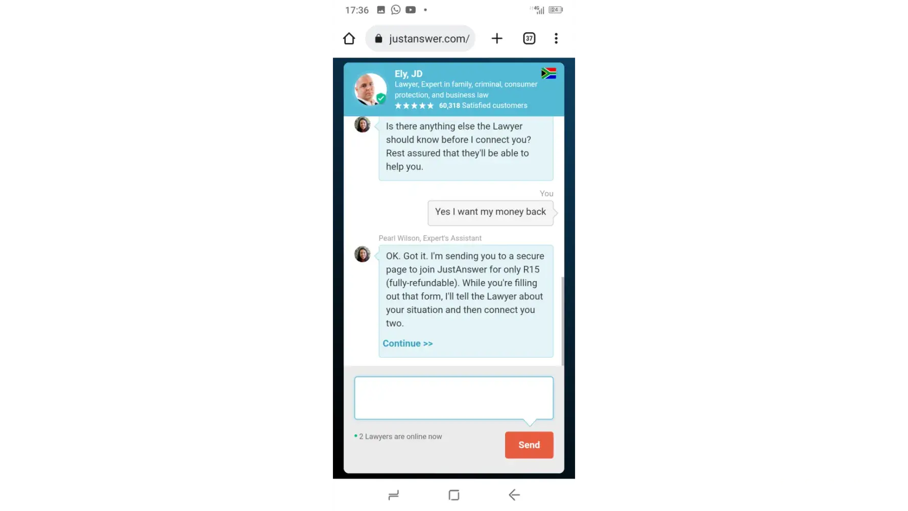 I would like an immediate refund from JustAnswer! I was informed that I could have my legal question, the ONE question I wanted to ask, answered for R15 as soon as I fill out the payment form.