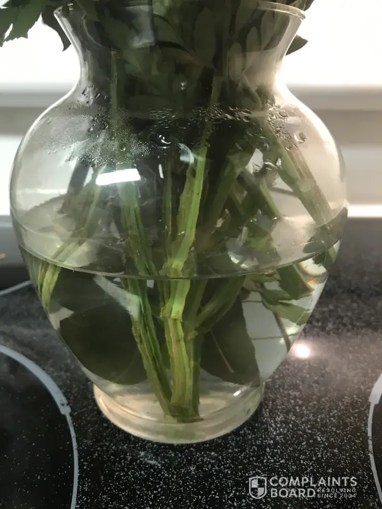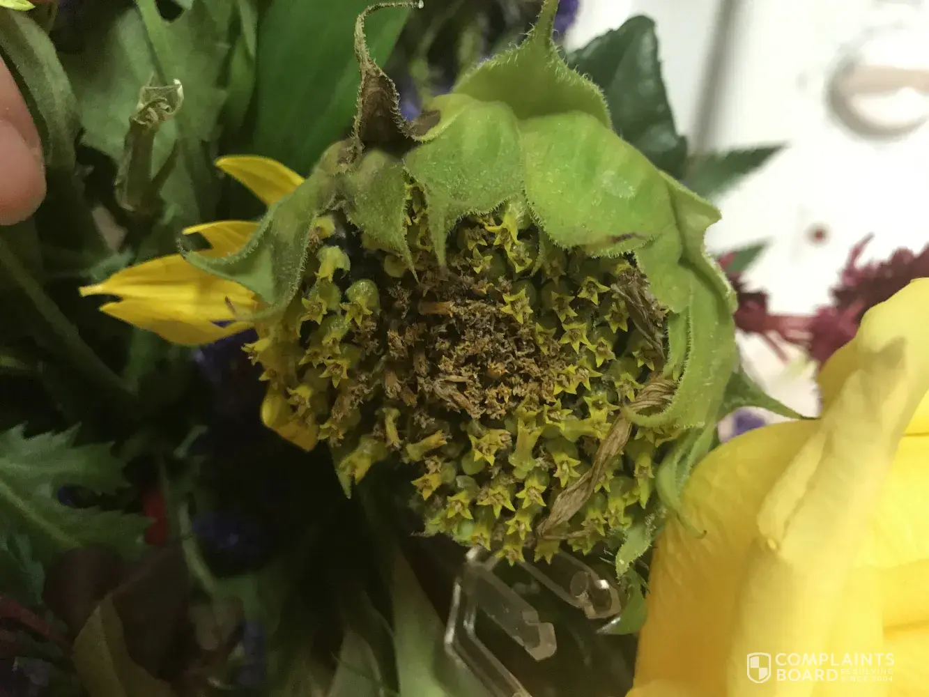 Here is a copy of the email that I send at the end of July. I'm sorry but you will sense my frustration in the email. Their resolution was a $10 credit and asked me to send another picture that would show the back on the flowers. That is not necessary when you actually see the picture that I did send, and it was too late to try and get a copy of the back.