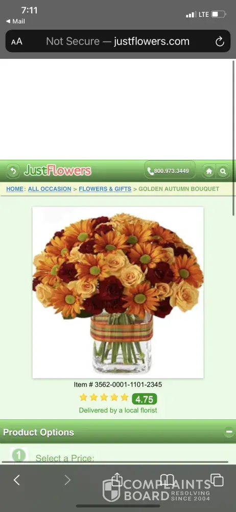 I ordered the $75 Golden Autumn Bouquet (picture below)for my father-in-law's birthday. What he received was a vase with five red roses, five pink carnations and a couple of lilies with a bunch of greenery. This is not even close to the fall bouquet and is certainly not a $75 arrangement. I spoke with customer service and they said the florist had to make a slight substitution but would refund me $10. As you can see, nothing is like the arrangement I ordered. Not one flower...not even the type of vase. This was a total substitution, not a "slight" one. Just Flowers should be refunding me $82 for the total cost since the arrangement was wrong, embarrassing, falsely advertised, and for wasting my time trying to get a respectable resolution.