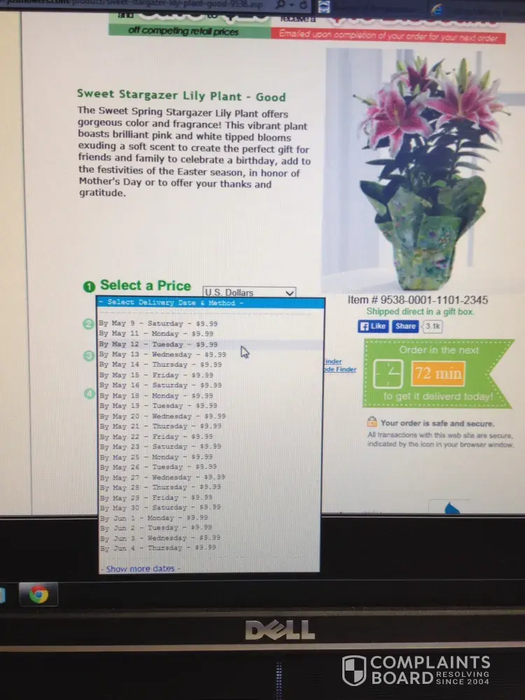 They sent a picture to the florist that should have been $59.99 + $10.00 bouqet for my wifes B-Day & Mothers Day it was'nt worth $30.00 according to the florst who deliverd it. They never gave the florist time bus. closed or not to contact my wife. They tired to deliver at 6pm left a msg on my wifes phone. Their all in another country, delivery it arrived 2 days later! RIP OFFS DON'T ODER STAY AWAY