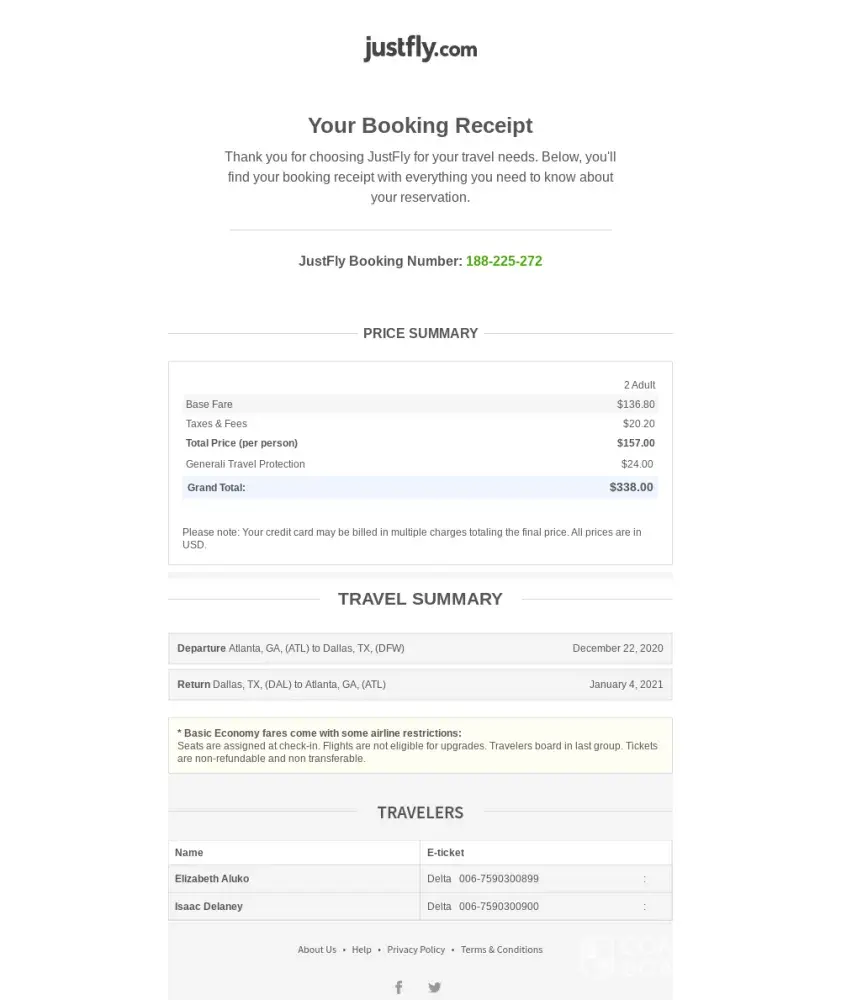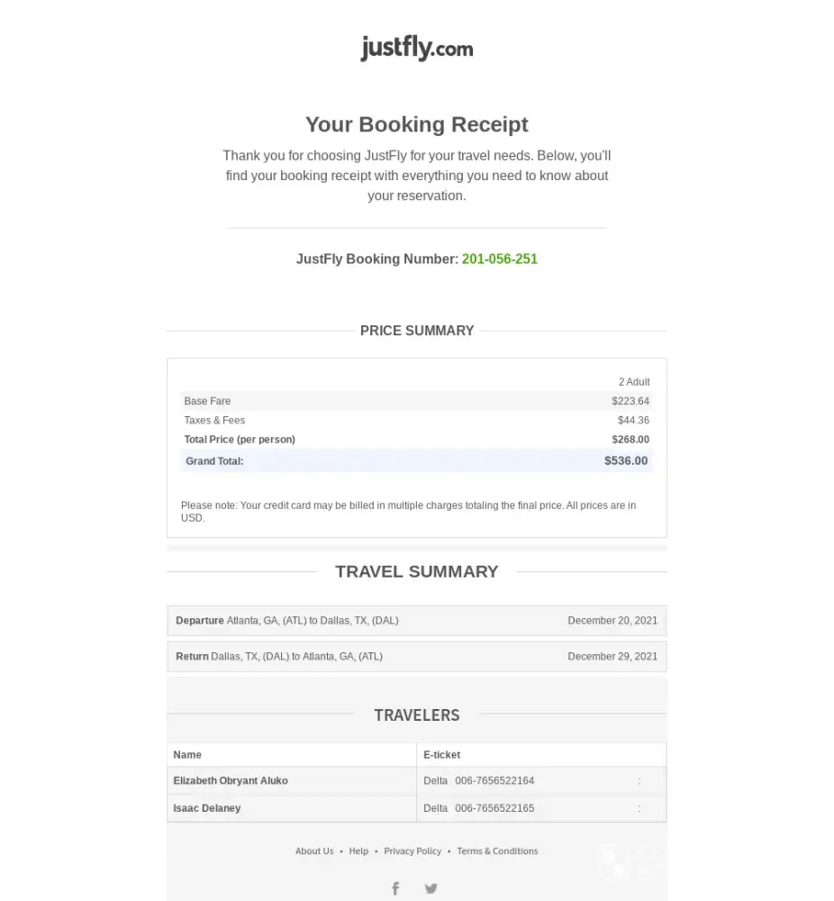 The Justly sold me a ticket for a flight, and they told me that my card was not accepted by their company, so they sent me an-email saying that I should update my new credit card, so I did it. However, for my surprise, they "created" a second ticket code with the same passengers, same destination, and same date of travel, and charged twice for the same flight.