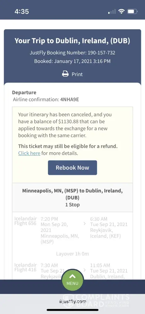 I saved up for two years and finally was able to book at trip to France. I bought my tickets and the insurance. I received an email that my return flight has been canceled. There is no way to pick another return flight on the website and I have spent two weeks, numerous emails and, today, nine hours on the phone with JustFly to get this resolved. The only time I got through to a human, he hung up on me.