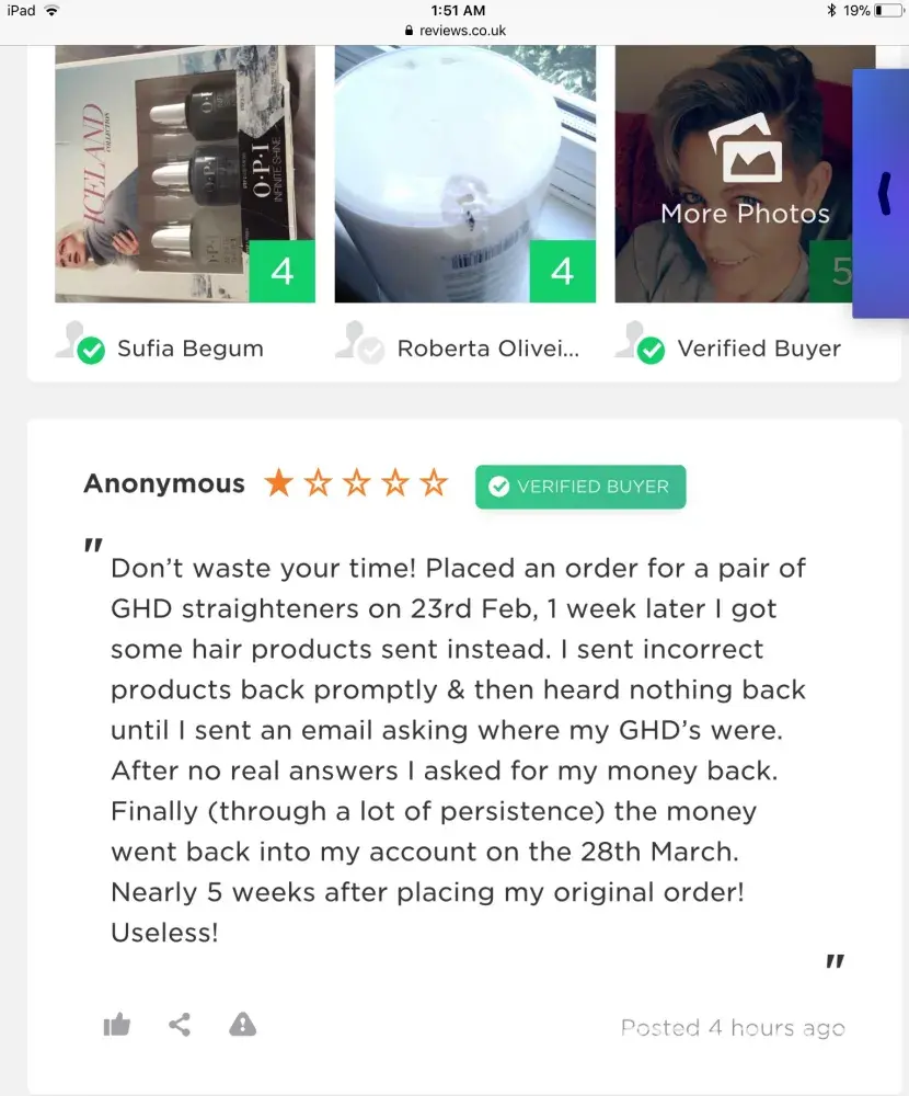 Don't waste your money and buy from a reputable well known company. If something seems too good to be true it usually is and I wish I had read these reviews before buying from this cow boy scam site! Purchased some GHD curlers as a gift and unfortunately they were the wrong size. I contacted customer service and explained what had happened and that the box had been opened but that they were incorrect had been put back as was and I wished to return. I sent them back by secure courier at a £15 cost of mine which I was happy to pay as I had ordered the incorrect item. A week passed no refund so I chased customer service, I was advised that it can take up to 14 days to process a refund. I noted this as odd as their website clearly states please refer to our refund policy for returns which states- refunds are processed within 5 days. 2 days later I receive an email with 2pictures attached showing 2 strategically placed hairs floating on top of the box and some crock of bull text that since the items had been used they had could not refund. Oh and sit for the best bit if I wanted the item returning back to me I had to pay again! So now they were trying to charge me again and hold the product to ransom, Now had I been stupid enough to attempt to try and return a used the product I would expect to see the hairs wrapped around the wand not strategically placed on top of a hairbrush and a wand. Not only that but they were returned by courier yet the hairs hadn't moved in transit! I can not believe what a lying crocked company these people are and how they are even legally trading! If there was a problem on receipt of my return i expect to be contacted on receipt of the product not over a week later. And to send such a fake picture is beyond me! The product was about £20 cheaper than genuine reputable retailers and I wish I had known what this company was
