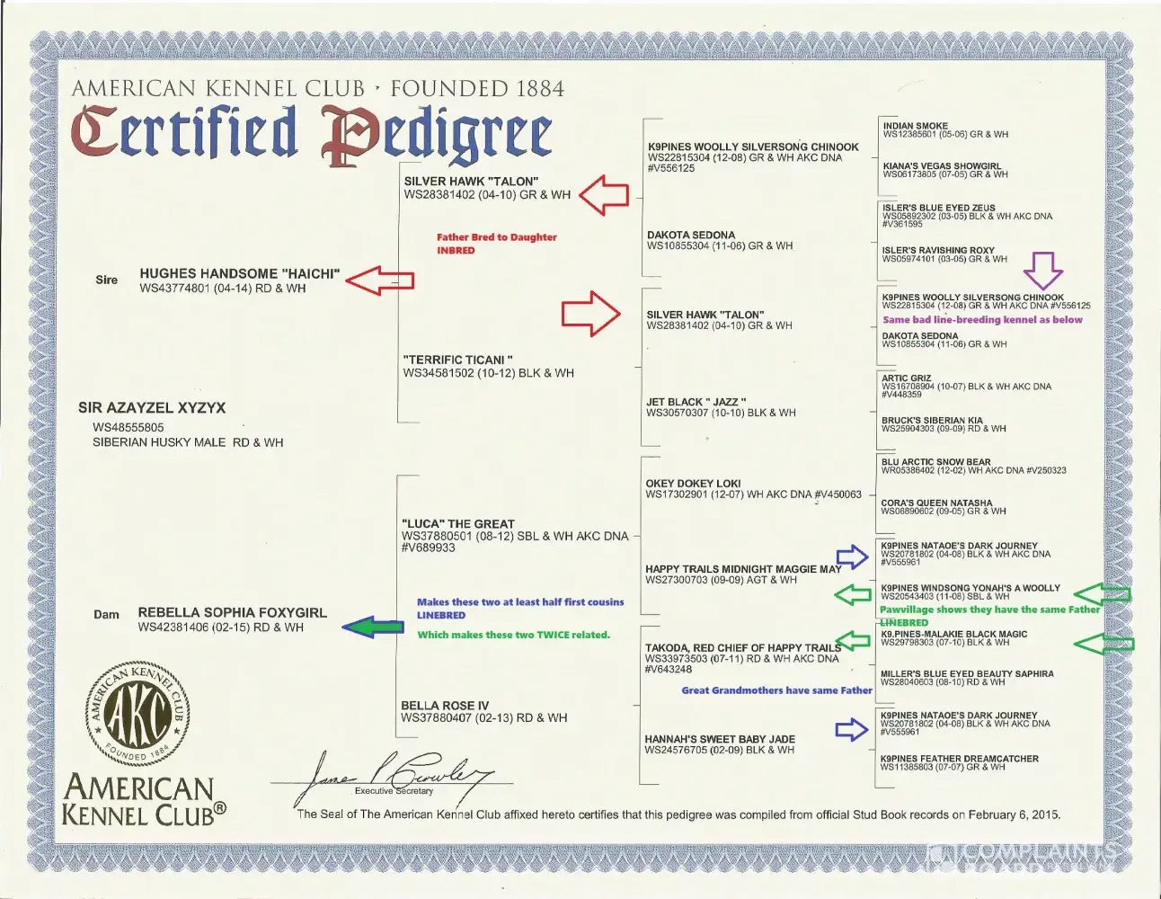Sindy Young, As you stated you did not purchase your husky from me. The dogs I owned are in the 4th/last generation on this pedigree. The dogs in the pedigree in front of that I never owned nor can be held accountable for how they are bred. The sheer fact that you felt the need to bash me over a puppy you purchased else where with dogs in the pedigree from 10 years ago blows my mind. I do not in breed and the fact that you can not post a pedigree from dogs I do breed from should speak volumes. You Sindy have done nothing but post MORE FALSE INFORMATION and I wish there were a way to STOP outright LIES for being posted. Your opinion based on this pedigree is CRAZY.