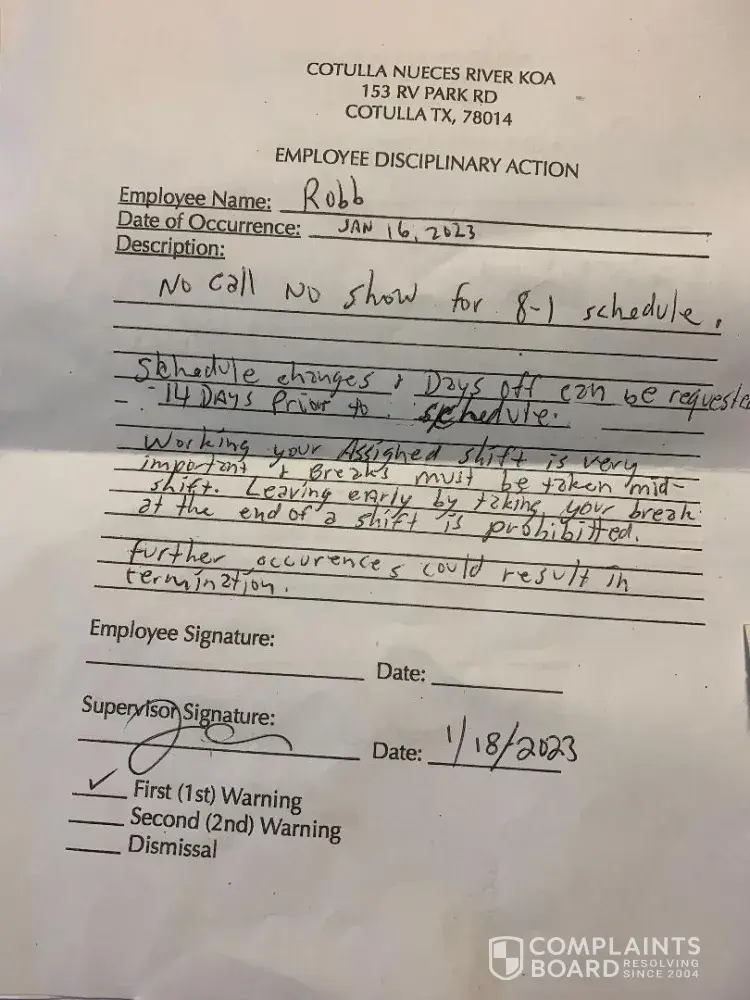 Cotulla KOA, were he handed a piece of paper to Rob, dated January 16, 2023, and told him to sign it.