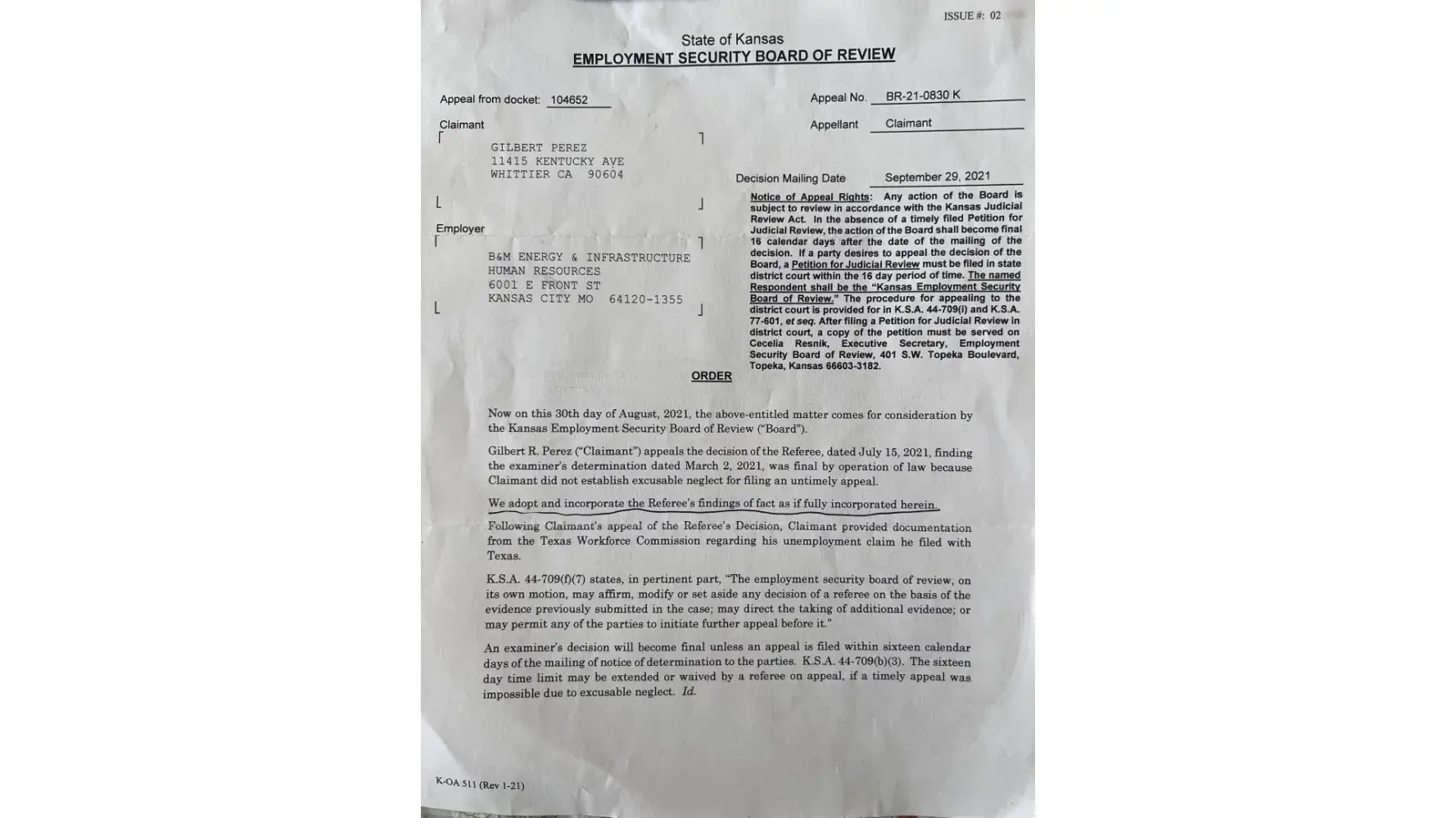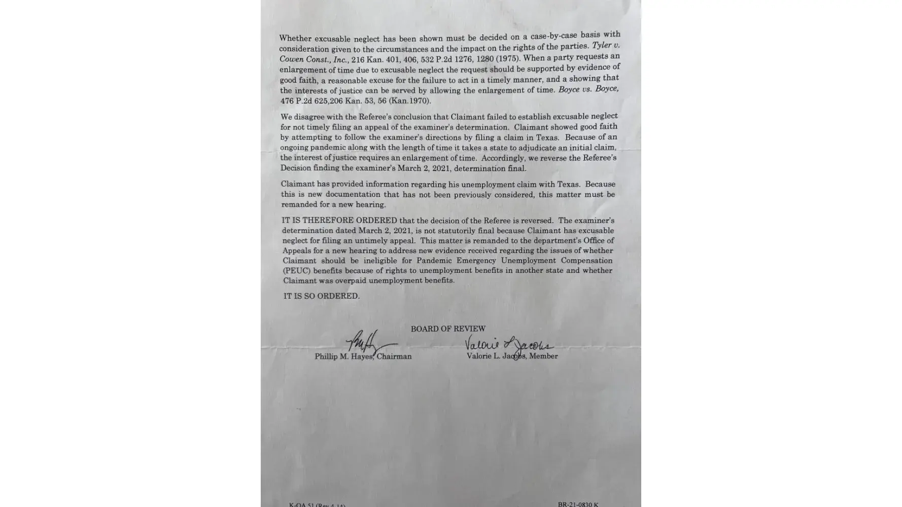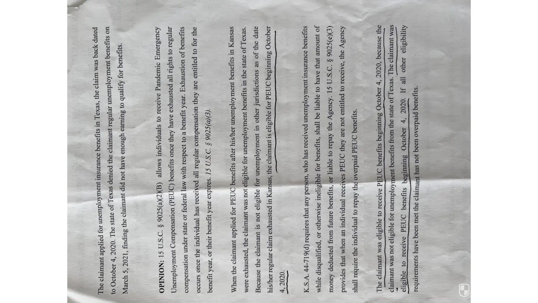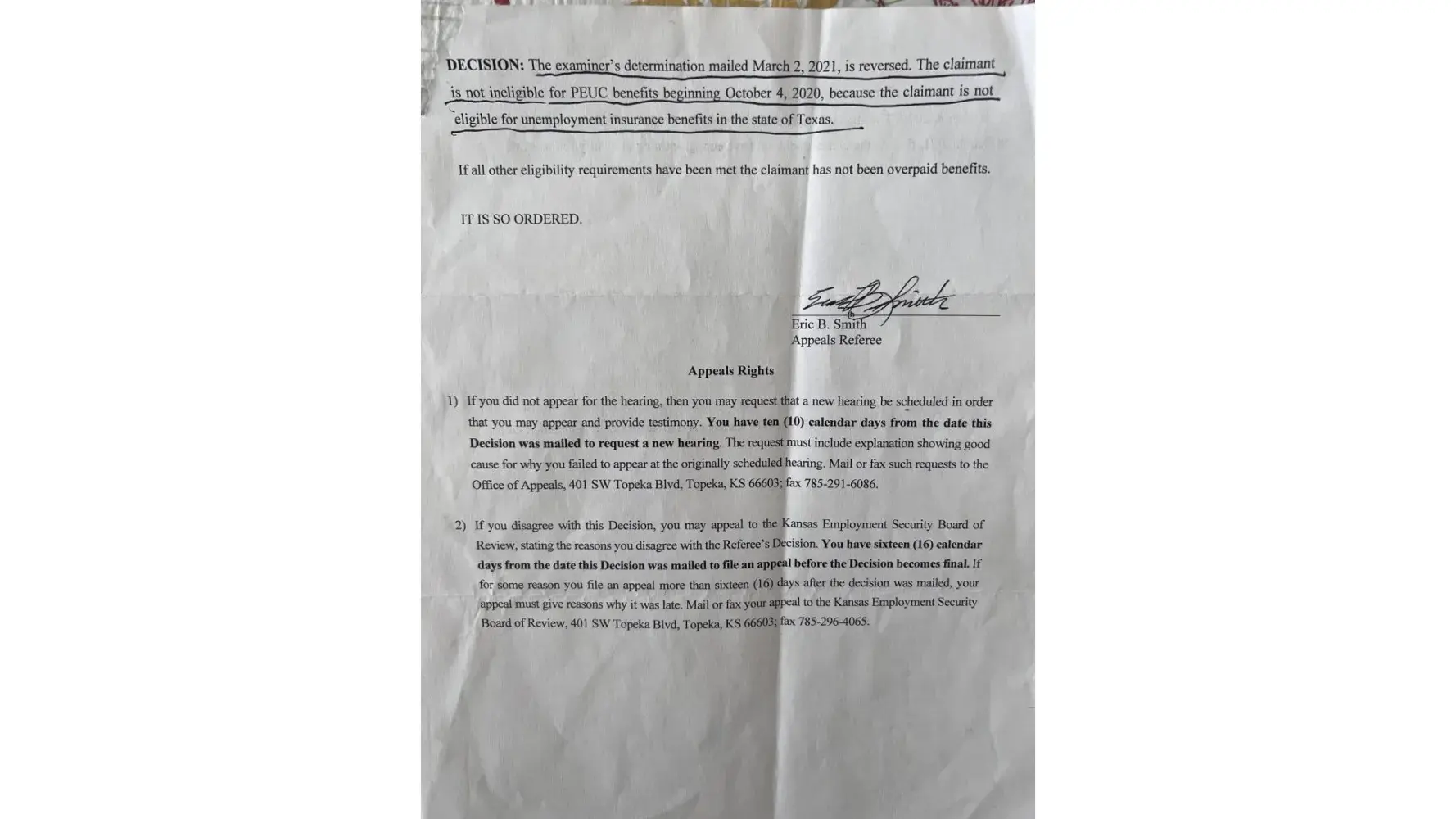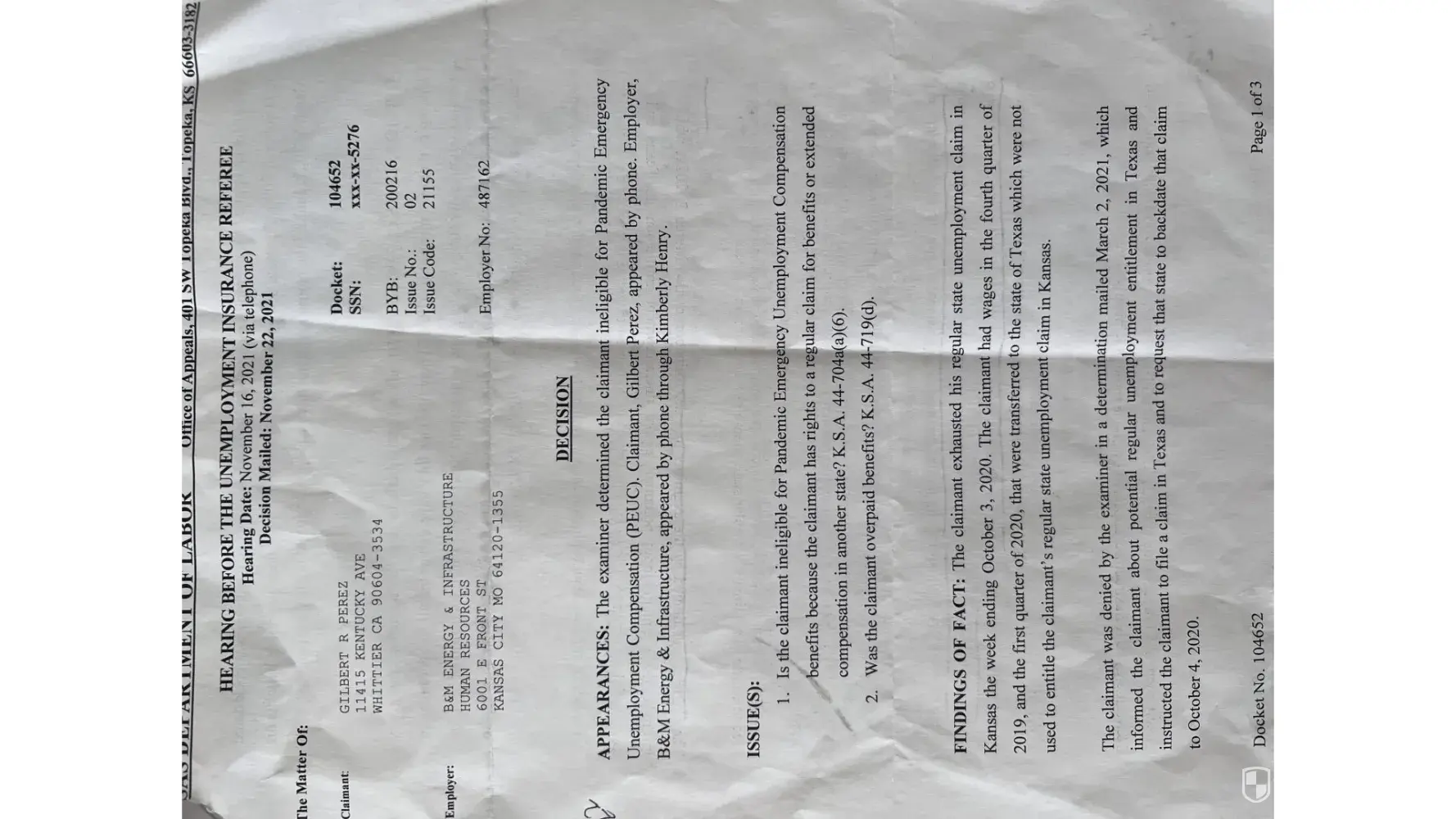 P.Gould took her own initiative and simply with out any research or concern as to why or how these wages from Kansas got to be claimed in Texas just figured or guessed that since the company I was about to start for is based out of Texas then simply no worries the Texas wages are mine. The company is not even based in Texas that is false information straight ignorance or lack of knowledge to ask for help seek appropriate guidance for the correct legitimate honest rules and laws for such situations to be handled in the correct professional manner investigation could potentially lead into something bigger. I’m not the professional in unemployment industry but this was very poorly handled since I overturned this decision with my appeal 3 times maybe 4 but 3 time this same timely appeal and over payment got reversed 3 times it never advanced to the money part where I presented the Denial Letter from Texas confirming I did not qualify for unemployment benefits in Texas their for since I did not qualify in Texas climate is eligible for PEUC benifits since climate exhausted regular unemployment benefits beginning 10/04/2020 ending 03/02/2021. The appeal reversals can reverse the other qualifying entitlements via Bar Inquiries