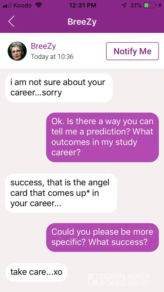 Do not trust this site! The psychics are liars who don't promise what they have. At the beginning of every chat you get 3 free minutes which is not worth it as 5 psychics that I talked with provide vague answers - short answers that are not detailed or specific as promised! On top of that they leave the chat room for no reason. (probably because they don't have an answer) *in the screenshot attached you will me ask a psychic ‘could you please be more specific?' when she abandoned me from the chatroom! Her description is a lie "honest outcomes and predictions are my specialities" my [censored]! She fools people to scrap their money and ending the chat abruptly going to the next person and so on.