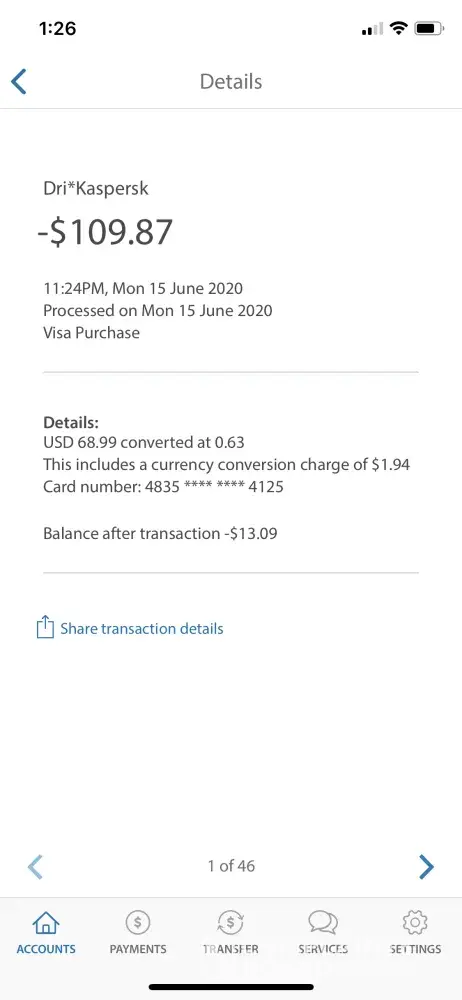 I was charged 69 us $ form my bank account without my knowledge on 15th june. I tried to contact the kaspersky lab but they could not help me in anyway. The transaction has happened in the name of dri kaspersk and the kaspersky lab was not able to identify this transaction. Currently I deleted my account fearing that I might be charged again without my knowledge. I would like to recieve a refund on this and this fraud transaction should not happen to anyone.