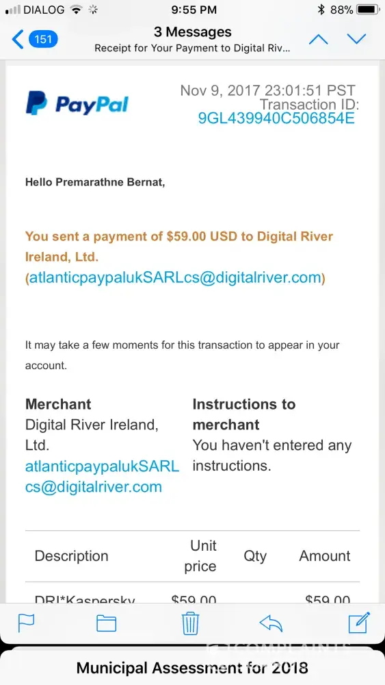 I installed Kaspersky Internet Security package in my lap top on 13 June 2017. It was working well upto date without any problem. Then, I received two emails on 10 November 2017 from PayPal confirmation of receipt of USD 59 and from Kasperskey confirming updated software.