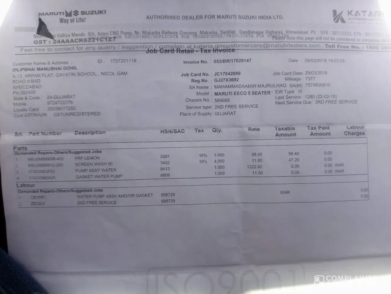 service with Kataria Automobile Athal, Silvassa, against Insuarnce claim. Total