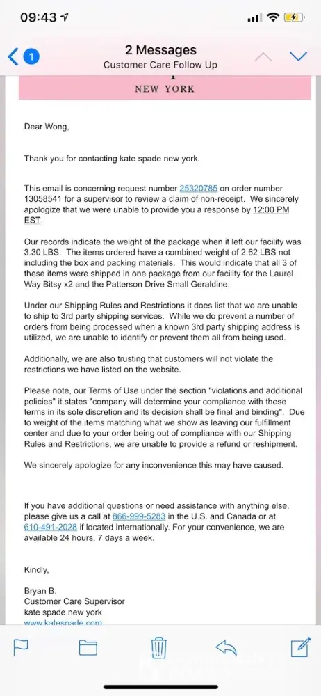 Feeling super disappointed for Kate Spade customer services.
