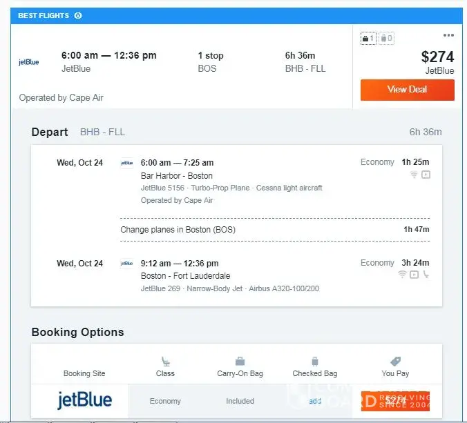 I did a search on kayak for a one-way flight from Bar Harbor, Maine to Fort Lauderdale. Kayak listed a flight flight of $274 using Cape Air and JetBlue. Above the search results in the fee assistant box, I did a plus one of a carry-on and a plus one of a checked bag. When you add or remove a bag in the fee assistant you will see a pop up that says Prices have updated based on your selection. when I added the checked bag the fare then changed to $304, which reflects the bag fee. When you select the flight details it says "You Pay $304" When you click to purchase the deal you are then redirected to the JetBlue site and the fare is now $353 and doesn't include the $30 bag fee. I did the chat with the Kayak help desk. I provided screen captures along with the details above and they said that the $304 is only valid when you book the flight. I explained that's what I was trying to do. I was then told that fare is no longer available and it will take approx. 2 min to update. I was receiving that fare info 20 min prior to reaching out to their support people because the redirect and higher fare didn't make sense. Yes fares change and I get that and know it well as I travel 75% yearly with my job.