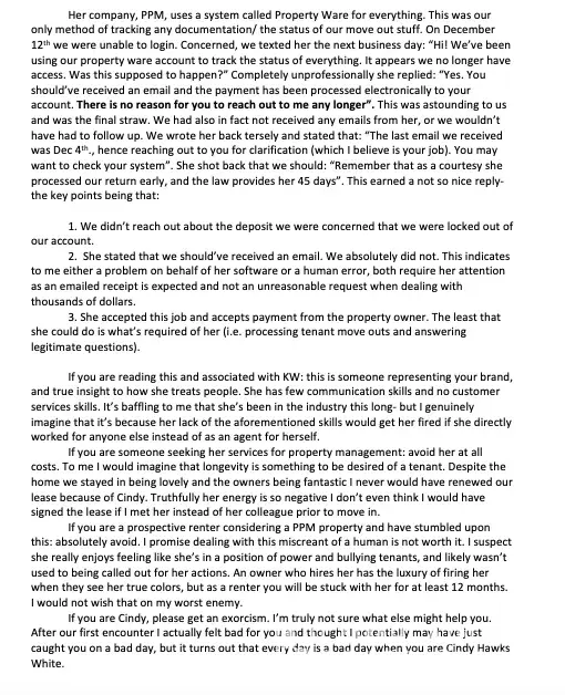 Short story: Agent is a horrific bully who also violated laws (sending someone else, not even herself to enter our home without notice). I believe that as a broker for KW, even though most of this occurred as she was representing her own business, her credentials are still a broker through KW and she needs to be held accountable as such.