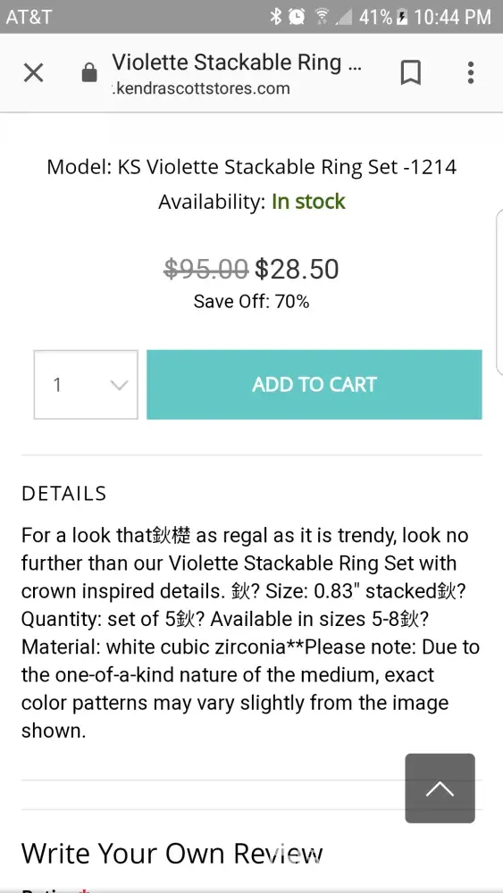 BUYER BEWARE on the website kendrascottstores.com that is being advertised on Social media sites. This is a scam/fraudulent website. It is not affiliated with Kendra Scott or kendrascott.com. I notice the Chinese symbols in the description and decided to Google before buying.