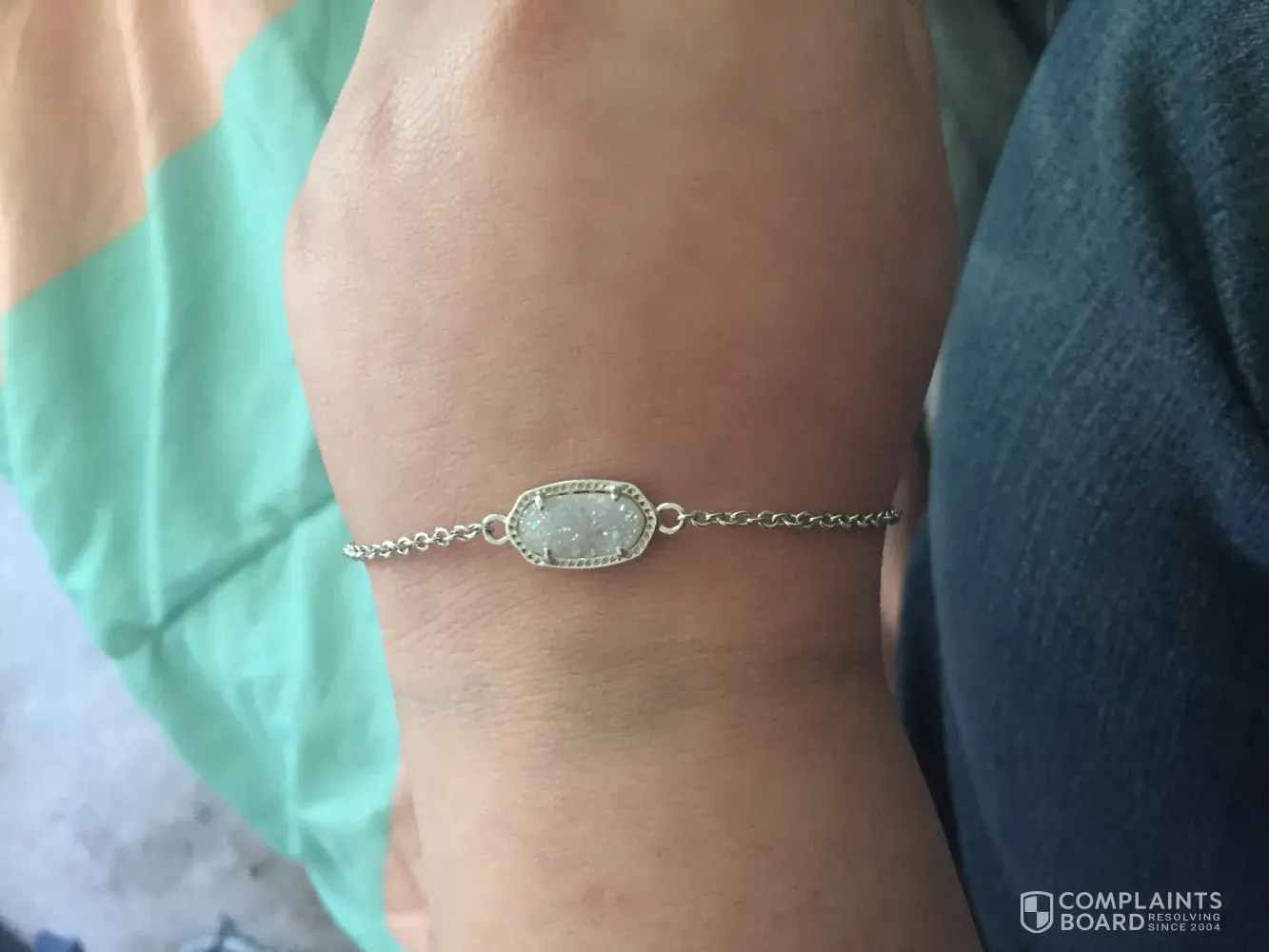 I've just bought a $65 Kendra Scott braves for my birthday about four days ago. I've worn this bracelet twice and I really liked it a lot. Very simple but very cute. Unfortunately today I noticed it was turning my wrist green and causing it to itch where the chain rests in my skin! It's FAKE! I was told it was sterling silver! I'm very angry to have paid such a high price for a piece of fake jewelry that I can't wear now. I can't believe they get away with charging that much and claiming it to be real when it's clearly fake. Shame on this awful brand!