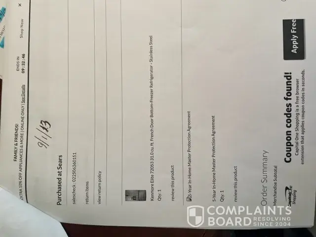 Kenmore Elite Refrigerator purchased 8/21/2018. 5 Year Service Agreement purchased as well.