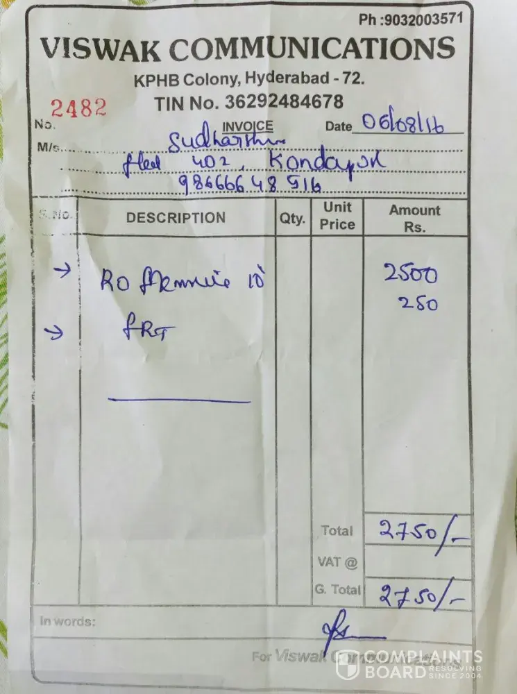 My Kent RO System was not working and I filed a complaint on Kent Customer care no.[protected]. An engineer visited our house and checked the machine. He informed that filters of the machine were to be changed to sort out the problem. He changed all the filters and charged Rs.5435/- for the same. After that, water with bad taste started coming. I complained about the same. Again same engineer came and checked but he could not resolve the issue. I contacted customer care to informed about this. They sent another engineer but he also could not solve the problem of bad water taste.