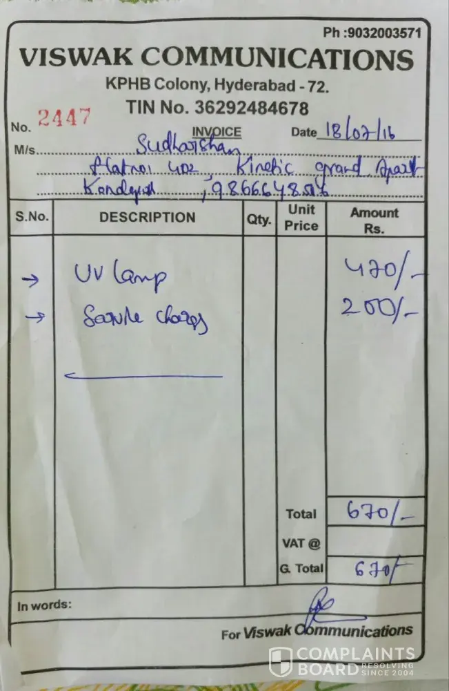 I have lodged a complaint with the KENT RO Company in this regard but the Company has not done anything to resolve my complaint.