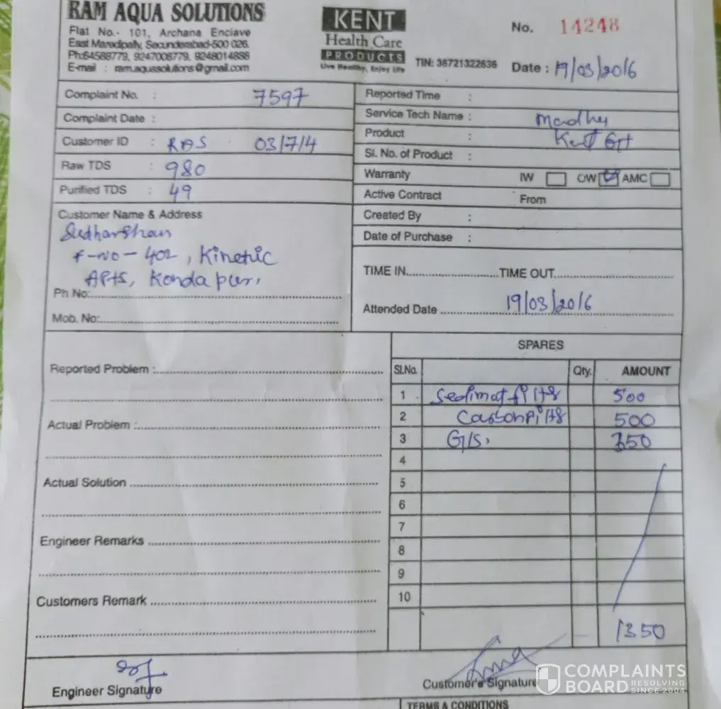 Hello, I had purchased a Kent RO (Serial no:KR140401086 ) in Sept 2014. However, since march 2016, I have spent Rs. 6200+ on it. I get a problem almost every month. In fact, when Kent sent me a person from an "authorized" service center, he told me to call him directly if any problem occurs, to resolve it quickly. Seems like he cheated, since Kent does not have records of my sequential problems. Also, if an "authorized" person tells me something, I would think he represents Kent. Anyway, I am attaching all my bills in last 6 months.