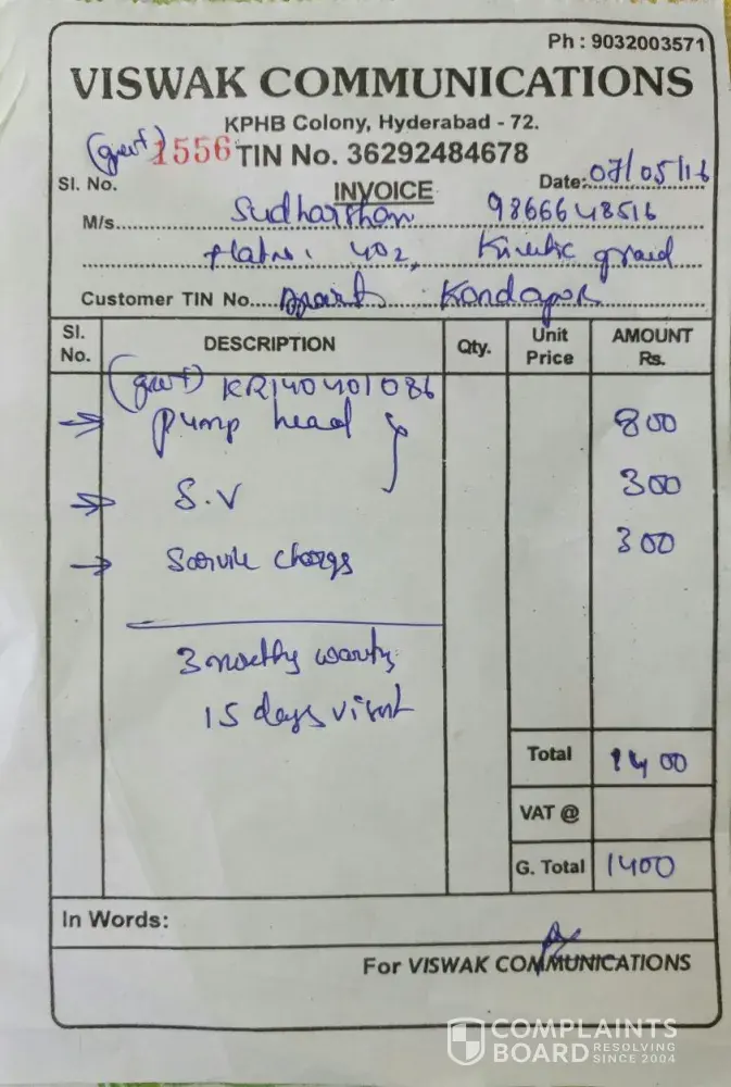 Recently the system started giving trouble. A complaint was lodged vide complaint number [protected] and Company’s technician Mr.Pradeep visited us on 9th February, 2017 and checked it. It was found that the Motor had developed water leakage problem.