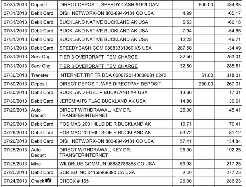 On July 31, 2013 Early in the AM my deposit of $500.00 was shown at my online banking. So at that point I had no charges. I shopped what I had in the bank during the day. And went to work. Then at late evening July 1 I started checking my account. That is when I noticed somebody switched my charges ahead of my deposit. The only proof I have is when Speedy Cash sent my money. And here is the resulting statement.