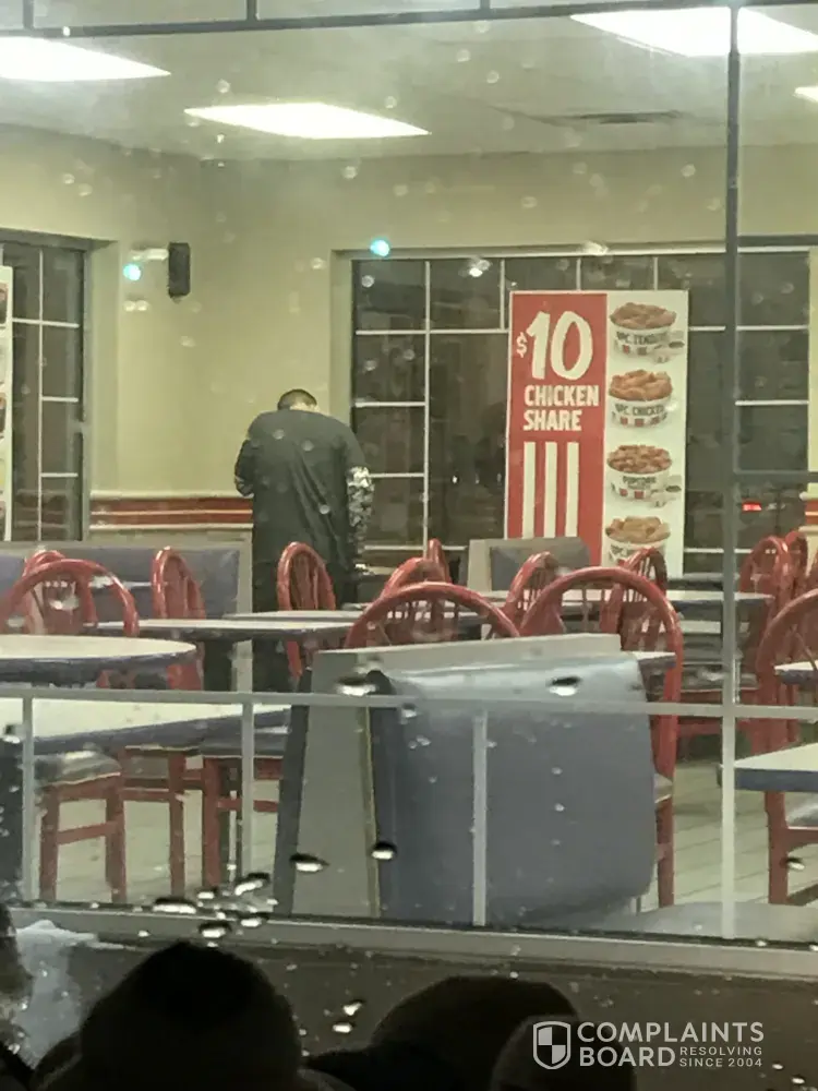 I've been going to kfc in banning for years n it's gotten bad over the yrs and I believe it's management not enforcing rules. The dining area is disgisting..how can it be dirty every time I walk in? Every table is dirty and nowhere to sit. Completely ridiculous! Then all I hear is employees talking and laughing very loud being very inappropriate at work when they could be cleaning. The floor in front of the drink machine is always wet and I've slipped a couple of times n they just add the Wet floor sign. All the floors are disgusting and window sills are so gross. I'm sitting next to one right now and it's covered in dried food smears. RESTROOMS omg beyond disgusting. Marco the manager needs to get it together and his team needs to be taught profesionalism in the work place.