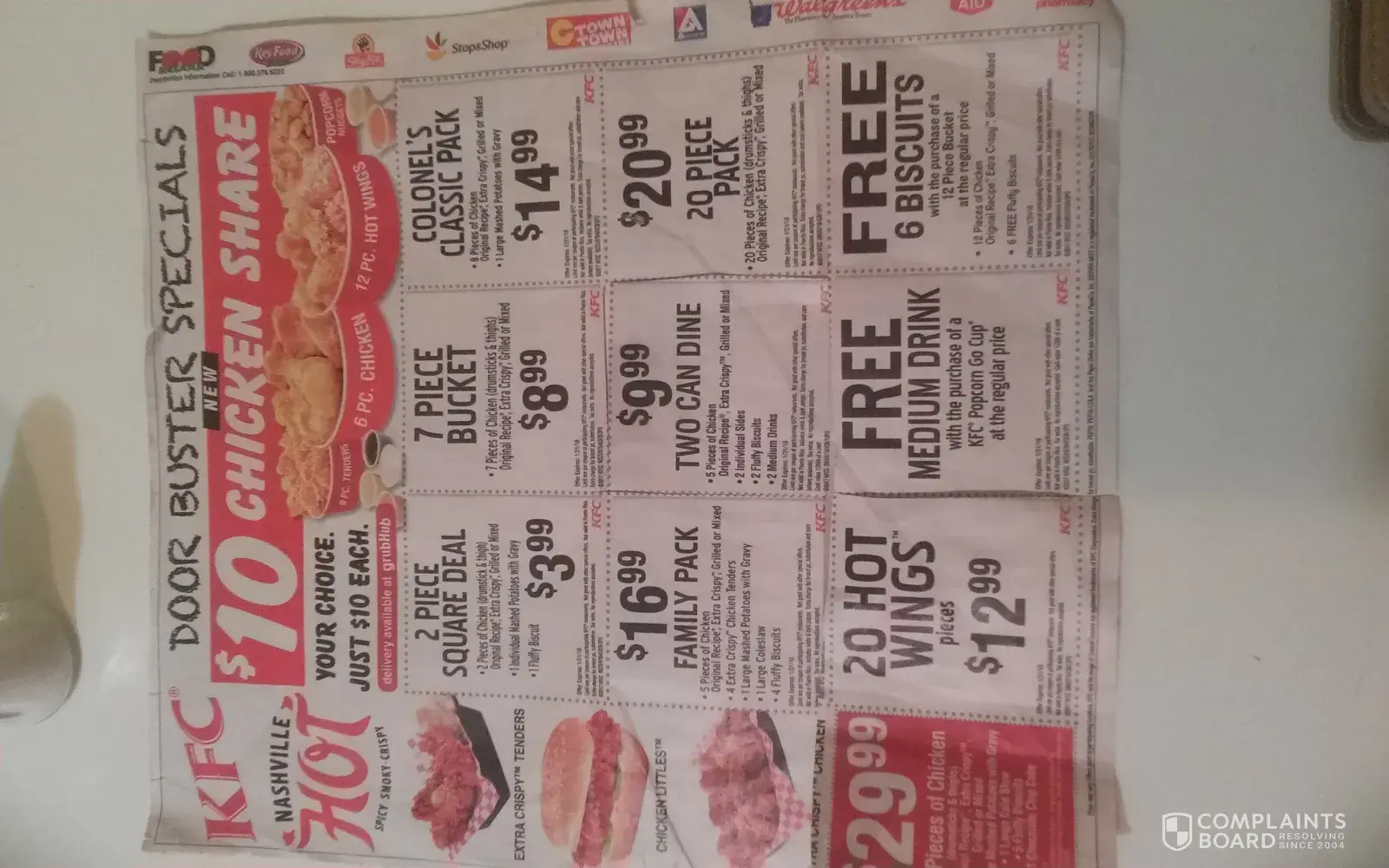 After I was refused I left and went home and called two of your other restaurants and couldn't even get them to answer their phone. And if you're advertising for KFC the ads should be honored at all your restaurants. Why do you expect the consumer to call all your restaurants to see if they excerpt your ad.