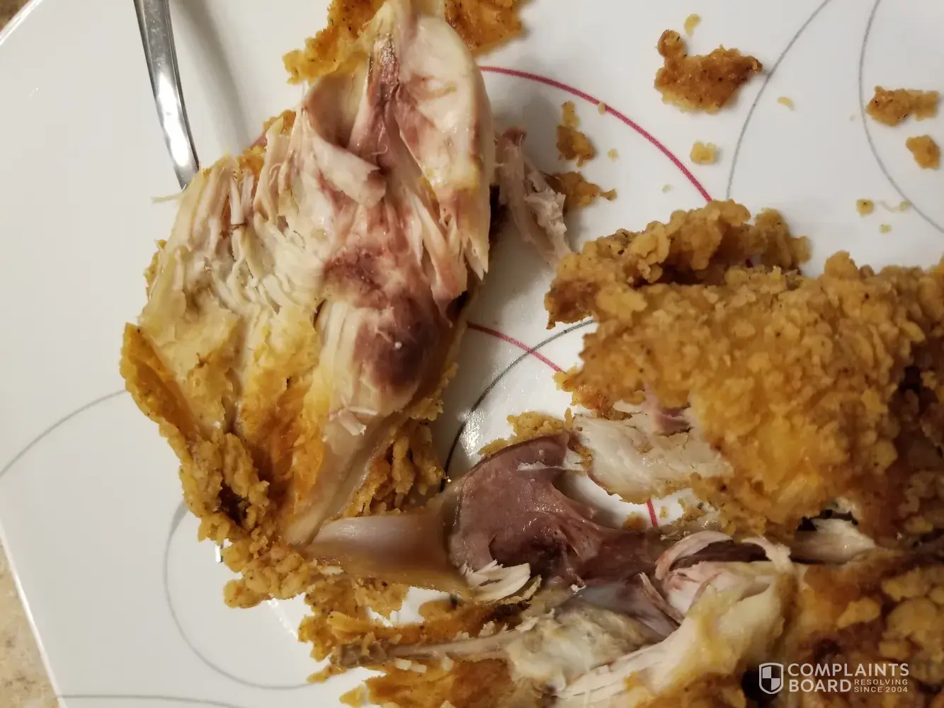 We went thru drive thru in waynesboro va abt 4 pm. On 11/21/17 .As we do every week We ordered a bucket of chicken and all the fixings. When we got home and started to eat we found the chicken to be red near the bone so of course no one would eat. This is the 2nd week in a row this has happened. Not sure what the problem is but we will find somewhere else to buy dinner. At least until we hear that the cooking has been corrected. Thank you for listening to our complaint. We will miss KFC.
