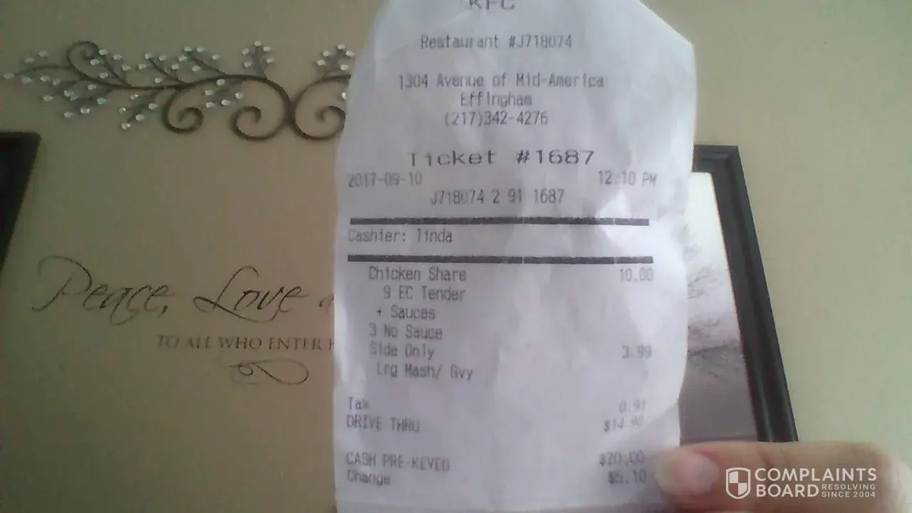 I posted my dissatisfaction on Facebook and multiple people respond, it happens to them at different locations. My mother was a manager for KFC for many years and knew Pete Harmon personally, Im sure that if Pete was alive today this store would be making changes or be closed permanently. The cashier was CALIEM and was very pleasant to us. My total bill was $59.72 not worth it if you ask me!