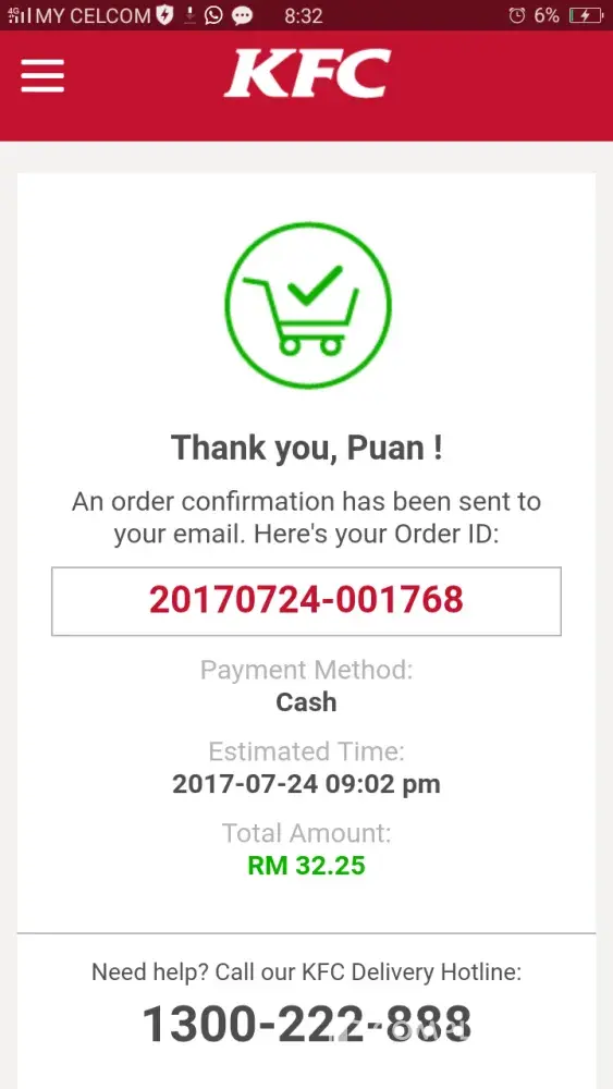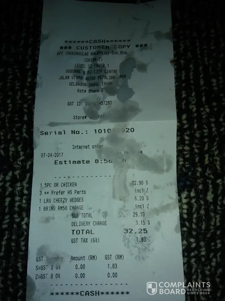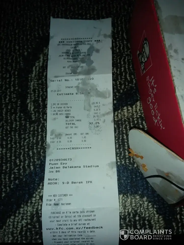 Saya tidak berpuas hati pasal ayam yang saya beli melalui servis delivery dimana ayam tersebut seperti sudah lama dan masih kemerahan serta berbau busuk..Saya sudah membuat aduan terhadap restoran kfc yang menghantar delivery tersebut melalui talian telefon [protected] dan bercakap dengan manager yang bertugas namun beliau menafikan tentang aduan saya..saya berharap agar pihak atasan dapat menyelidik restoran tersebut dan membuat pemeriksaan terhadap ayam yang dijual di agar perkara sebegini tidak akan terjadi lagi..terima kasih..iklas dari costumer yang kecewa.