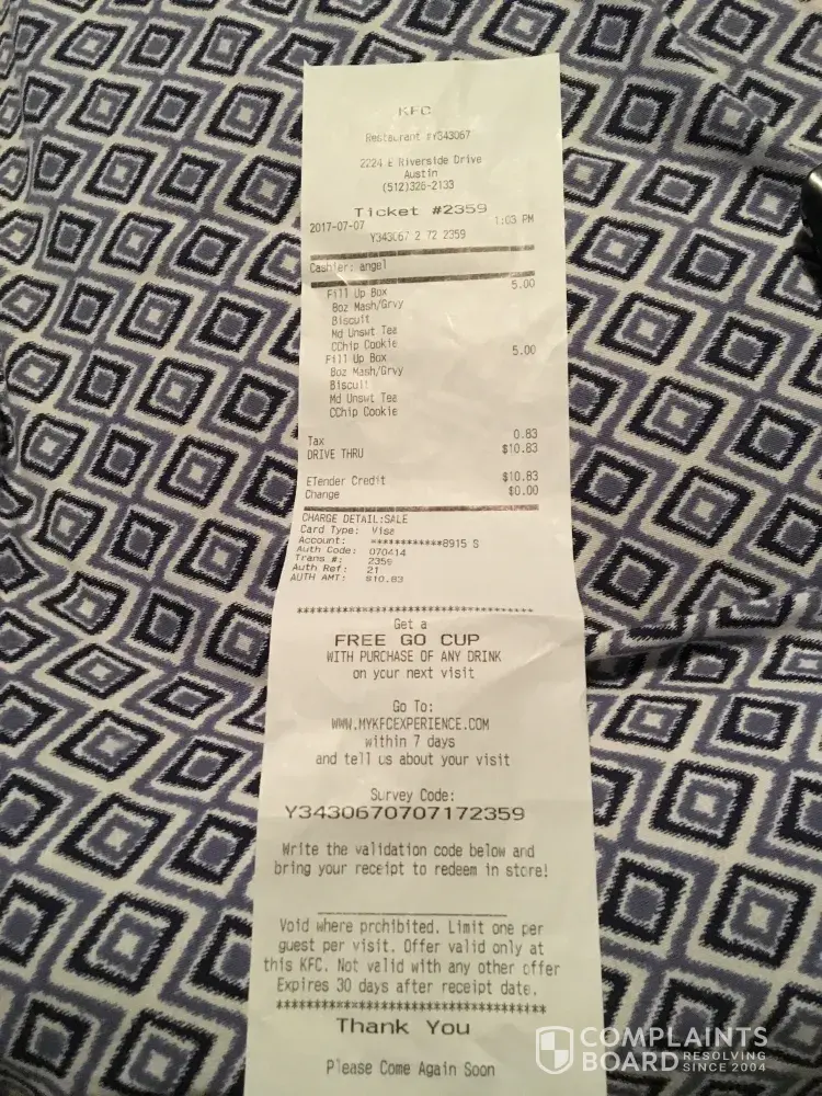 My hudsband and I always enjoyed KFC in past- however, this was the worst of worst & we did put in a survey with complaint, and did revieve a refund, however, when we walked in the same girl from previous visit was at counter smiling and asked us "you guys back for more?"we reponded - No - we are back to get a refund- then she just walked away from us - not even wondering why we were dissatisfied...nothing -Wow!