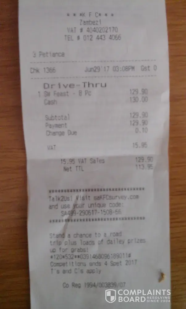 I was extremely disappointed after I bought a KFC - SW Feast - 8 Pc at the Zambezi branch. This is the second time that a similar event occur. I am a regular customer of KFC and I find the food good, but this was unappropriate.